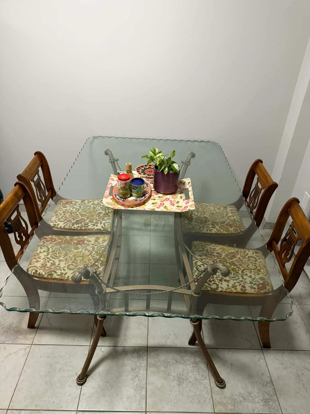 This dining set features a clear glass tabletop with a decorative metal base. It includes four wooden chairs with upholstered seats in a floral pattern. Perfect for smaller dining spaces or as an accent piece.