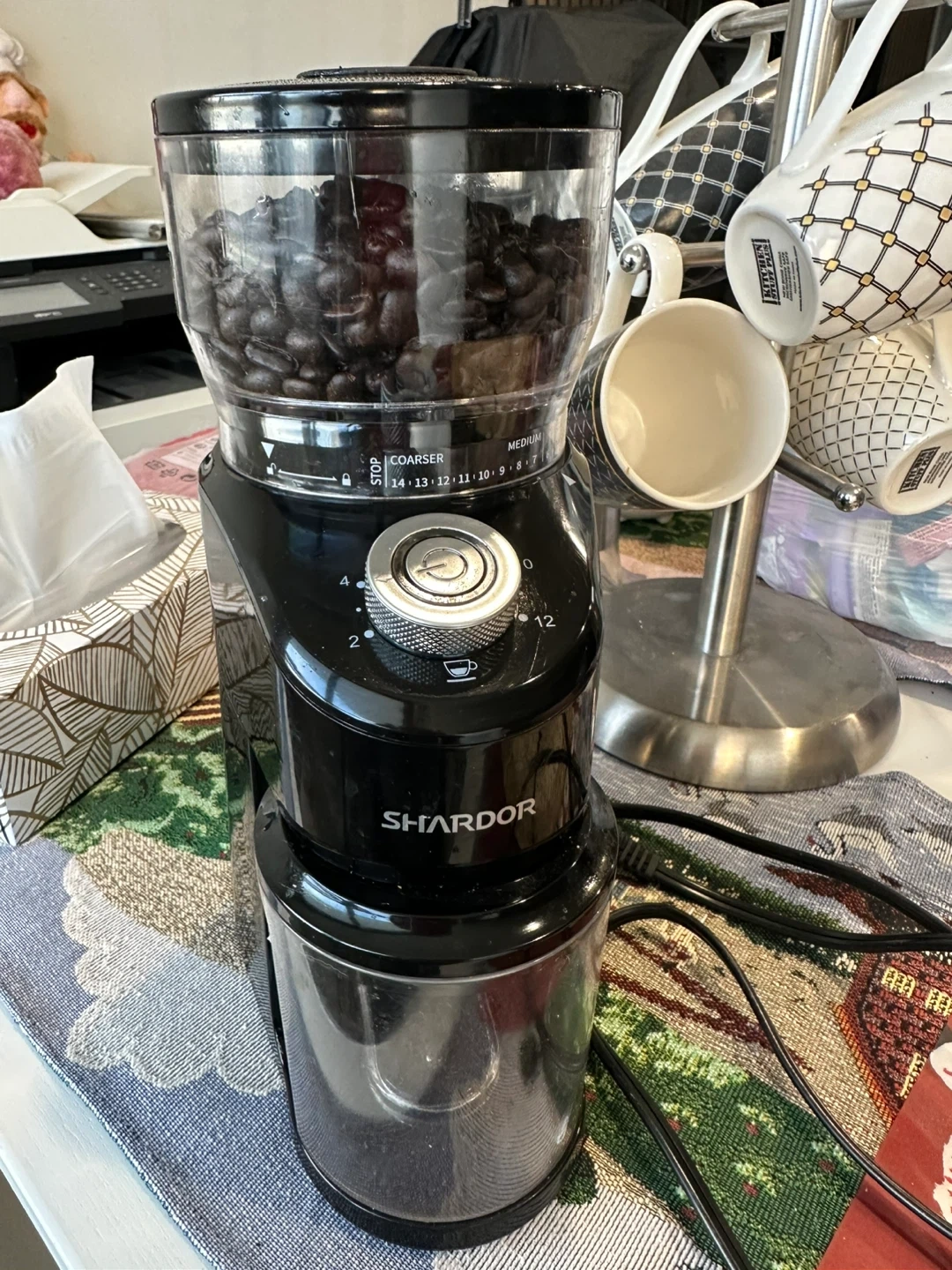 SHARDOR electric coffee grinder with a hopper full of beans. It has adjustable grind settings from coarse to medium. The hopper and collection bin are clear plastic.