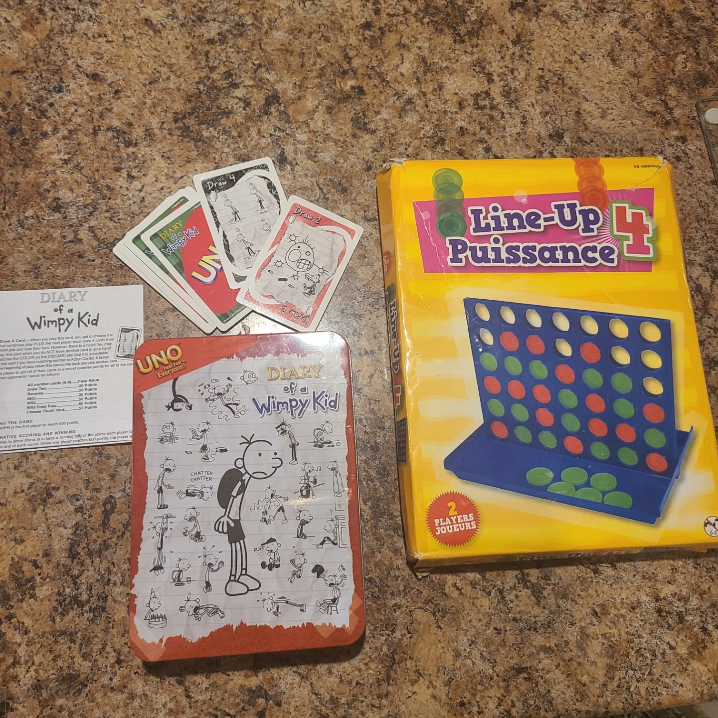 This bundle includes the Diary of a Wimpy Kid UNO card game, featuring custom cards and a tin for storage. Also included is the Line-Up 4 board game, a classic strategy game for two players. Both games appear to be complete and ready for fun!