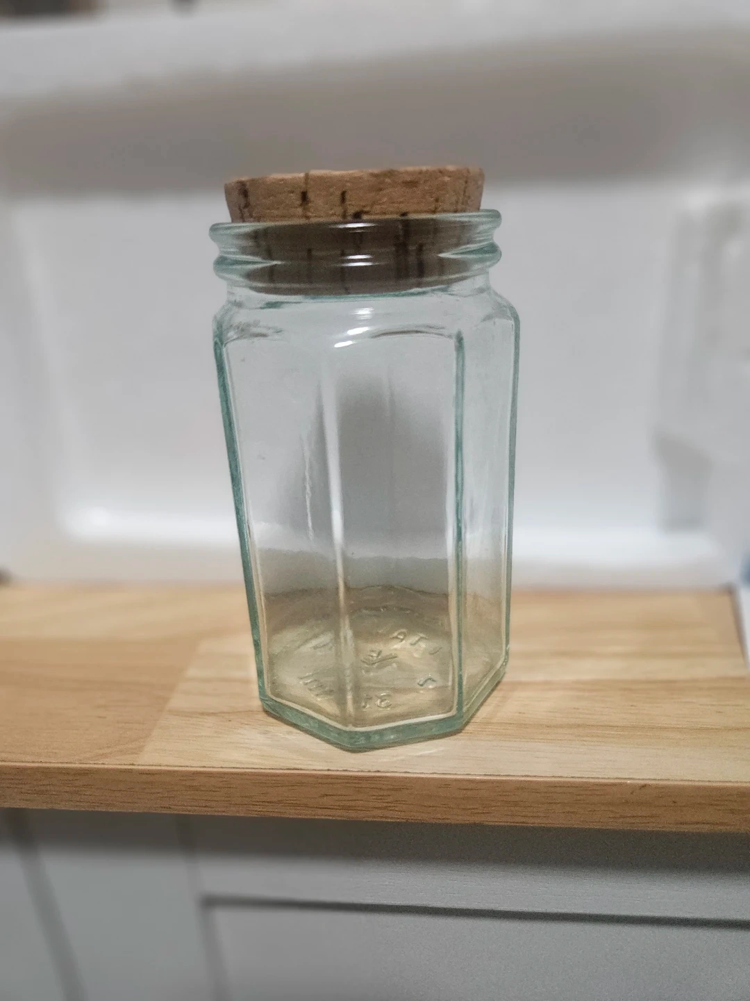 This is a glass jar with a cork lid. It's octagonal shaped and made of clear glass. The bottom shows it's made in Italy and has a capacity of 314 ml. Signed VE A (Viteria Etrusca)