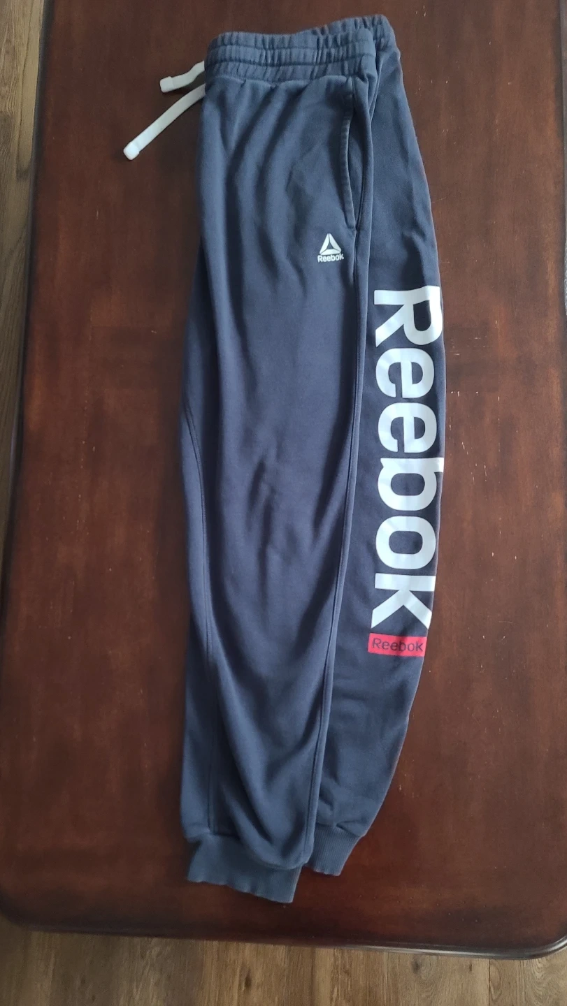 Selling a pair of dark blue Reebok sweatpants in a comfortable slim fit with tapered legs. These are great for everyday wear, featuring front pockets and an adjustable drawstring on the waistband.