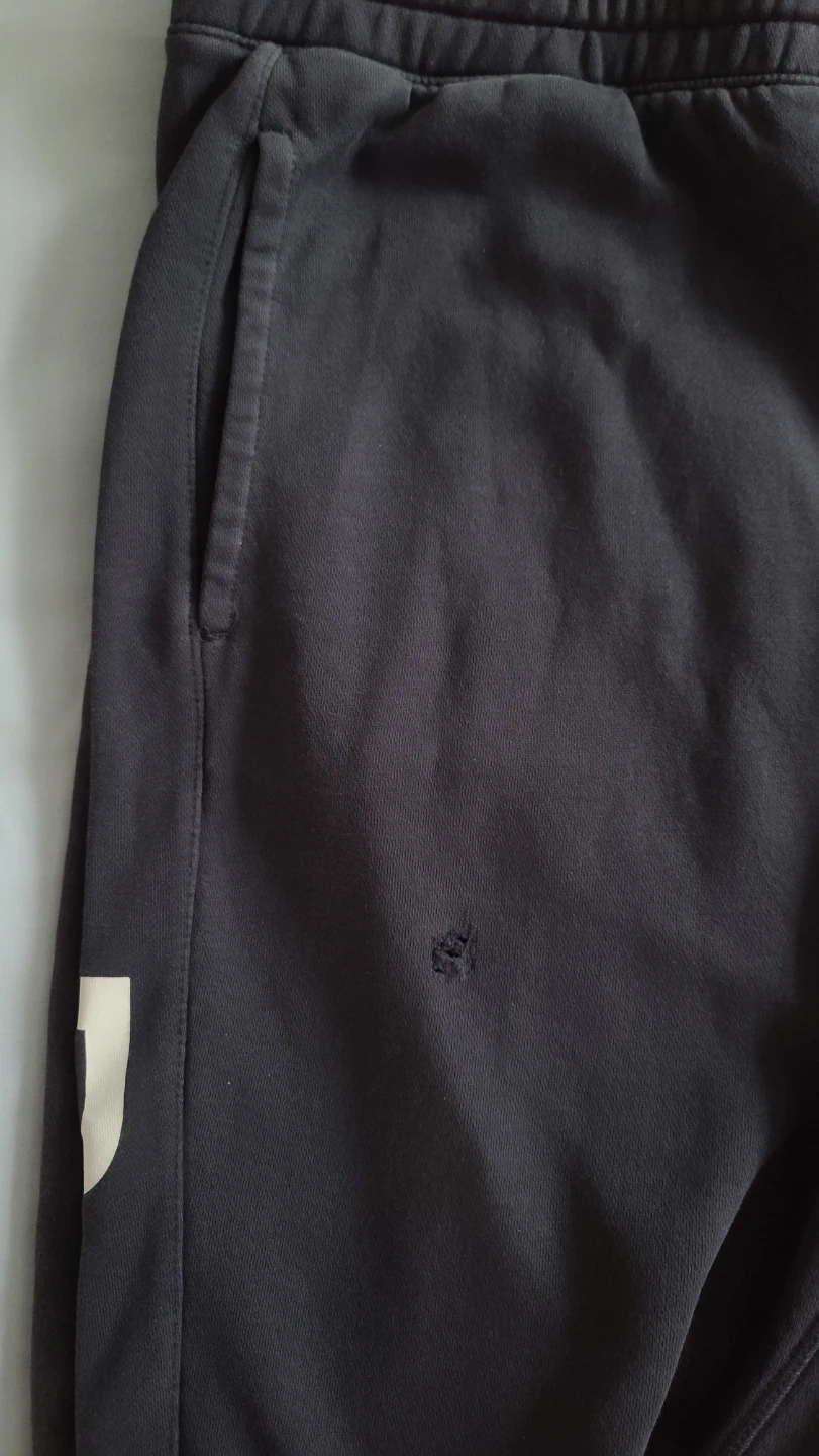 Condition Note: There is one small hole on the front under the right pocket (please see the close-up photo). Aside from this the sweats are in excellent condition with no pilling or fading. The price has been adjusted to account for the hole.