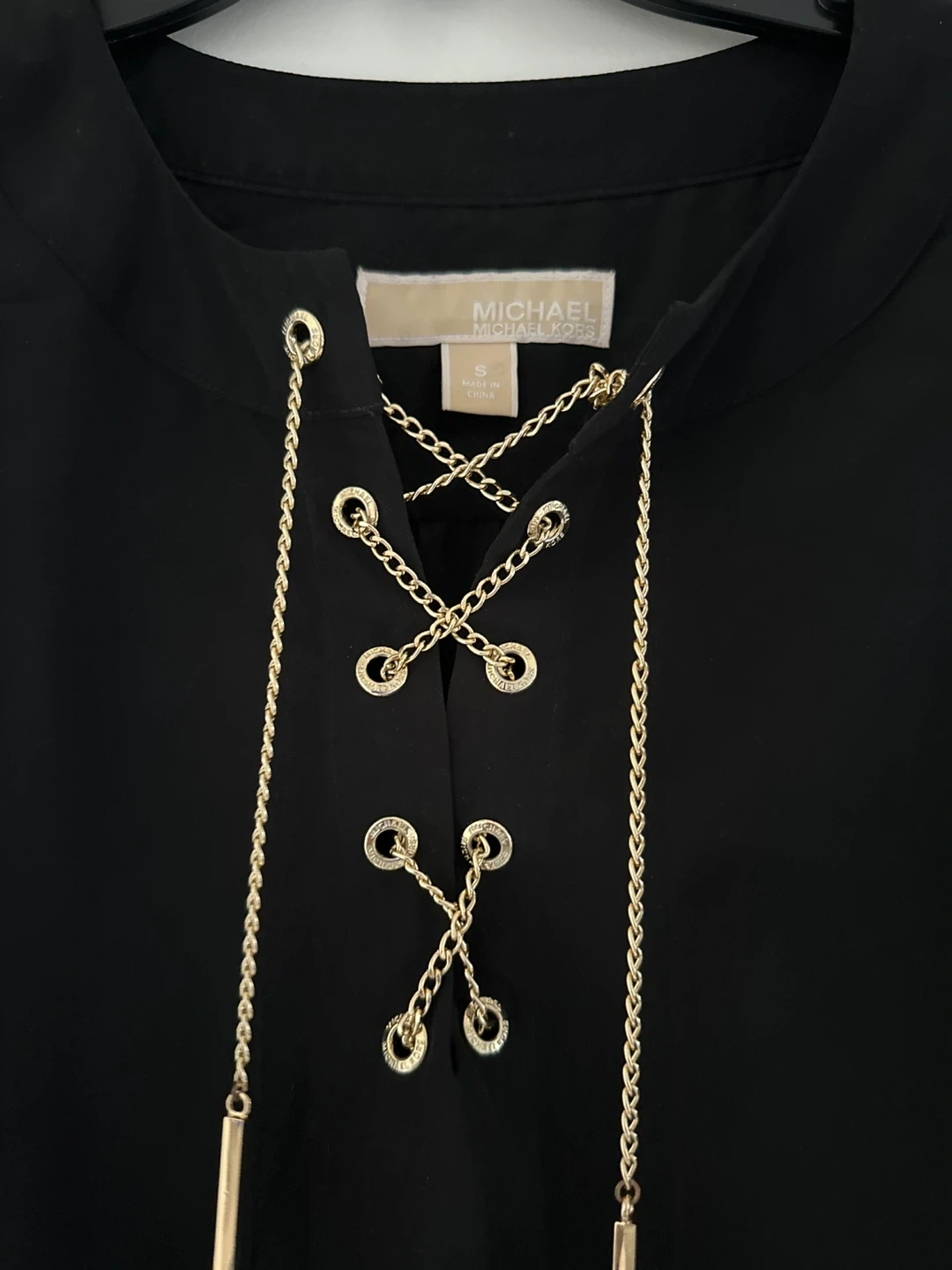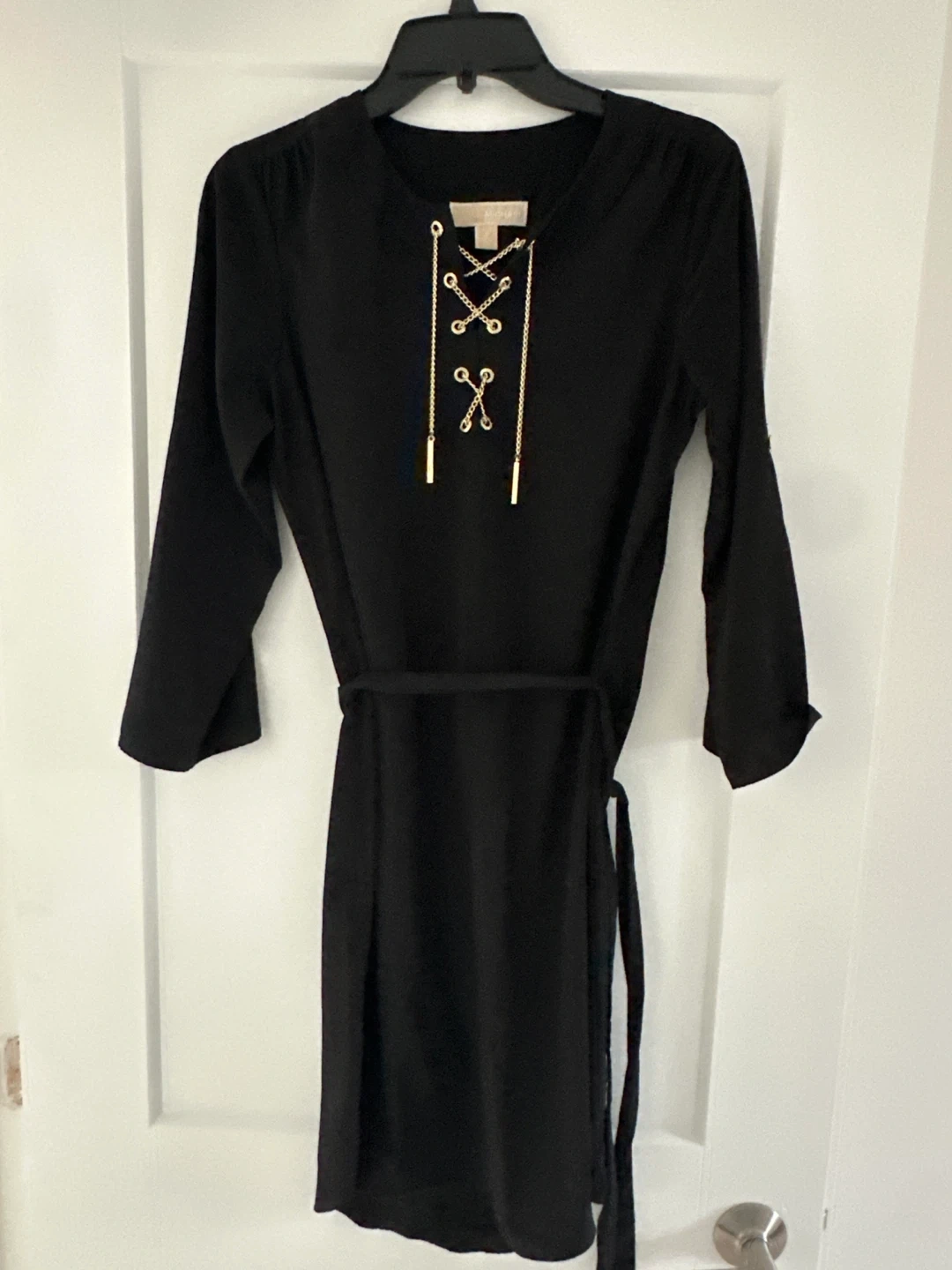 This Michael Kors dress features a stylish black lace-up front with gold chain detailing. It's a size small and comes with a matching black tie belt. Perfect for a night out!
