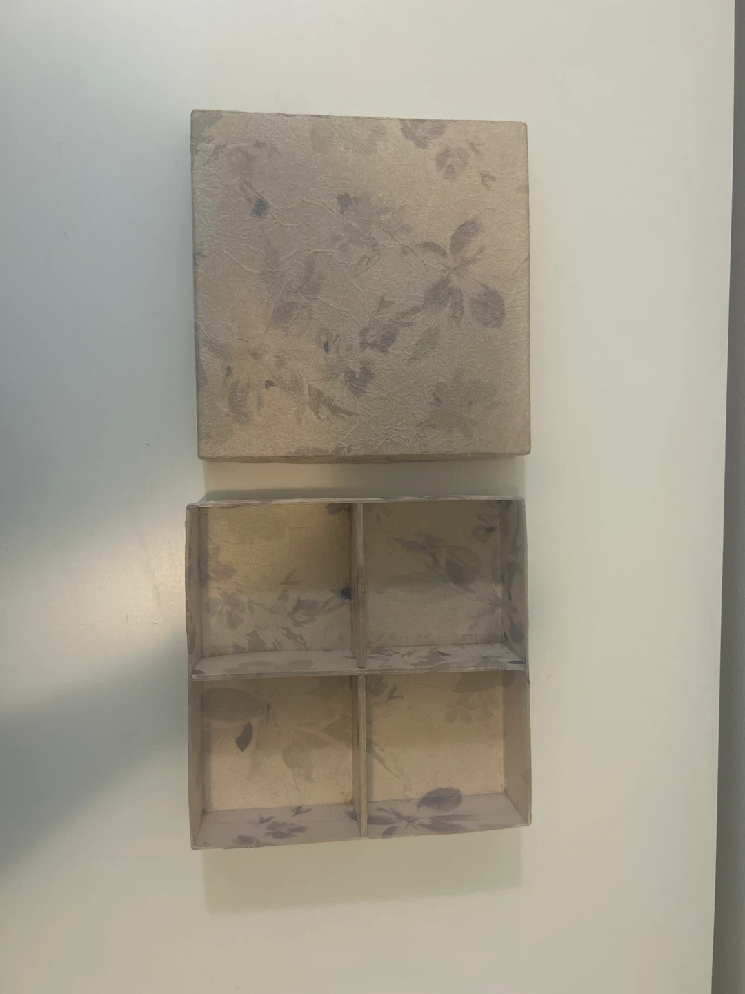 A decorative box with a lid and four interior compartments. The box has a textured paper finish with a subtle floral pattern. It's suitable for storing small items or as a gift box.