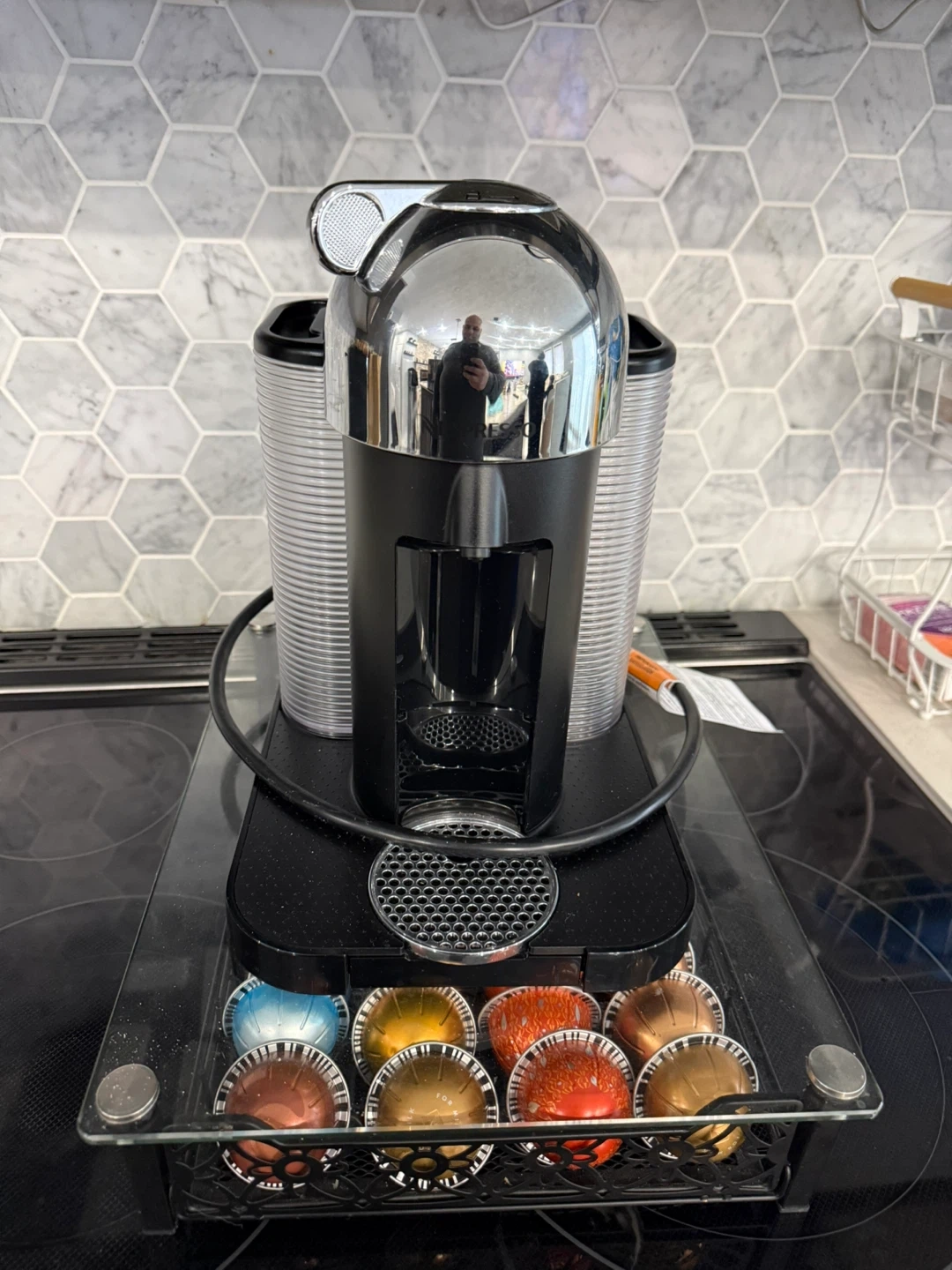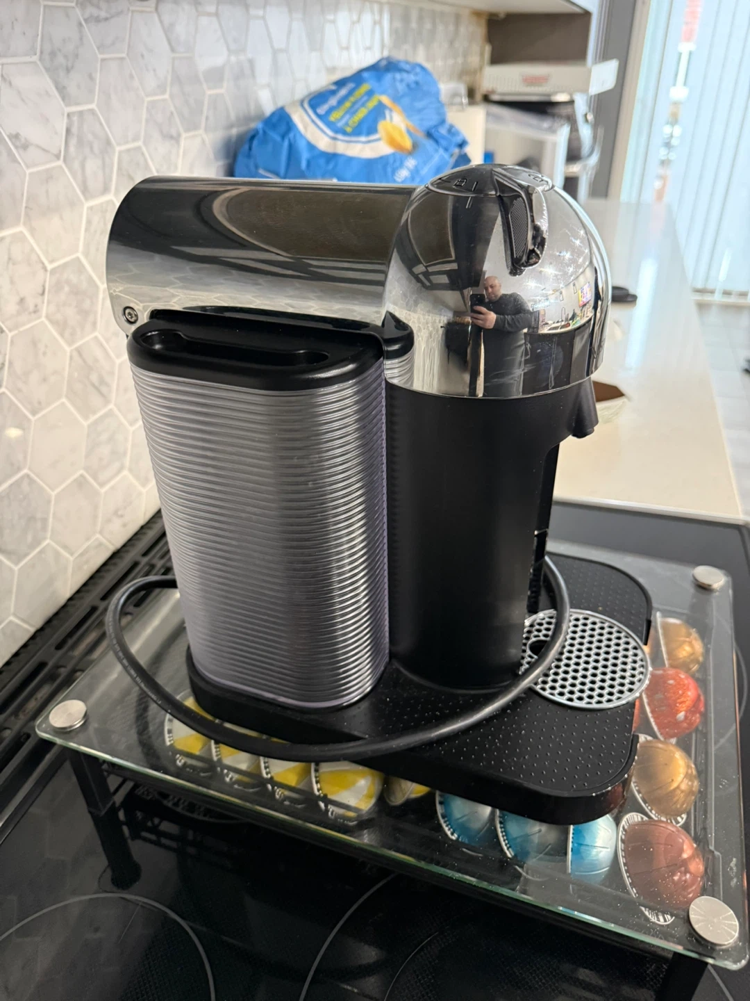 Nespresso Vertuo coffee machine with a chrome and black finish. Includes metal and glass pod storage and stand, and all pods in the stand, I also have 3 half sleeves left to refill the drawer! All included in price
