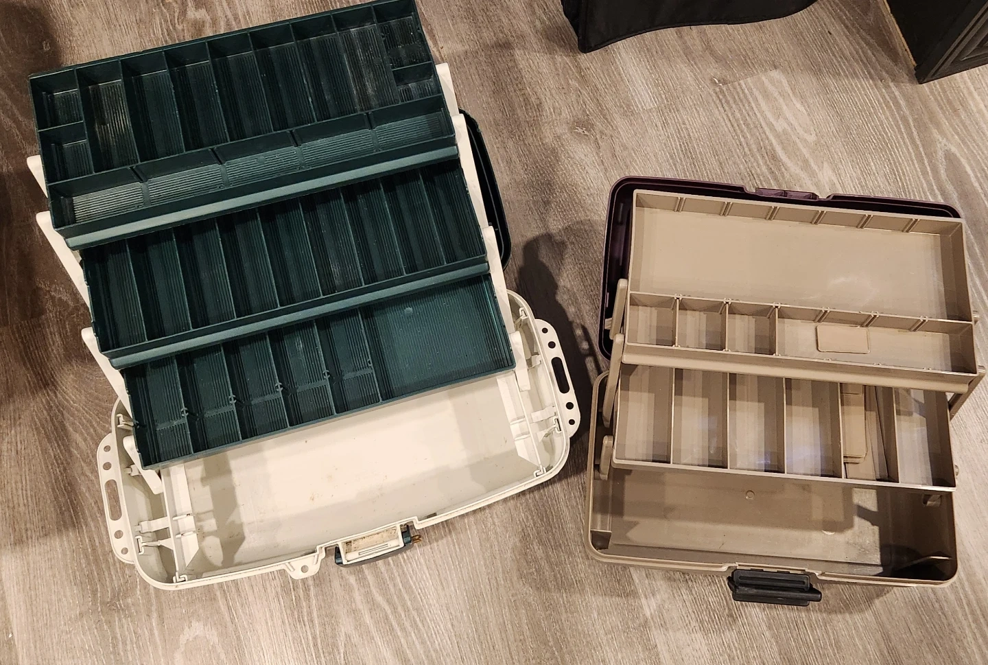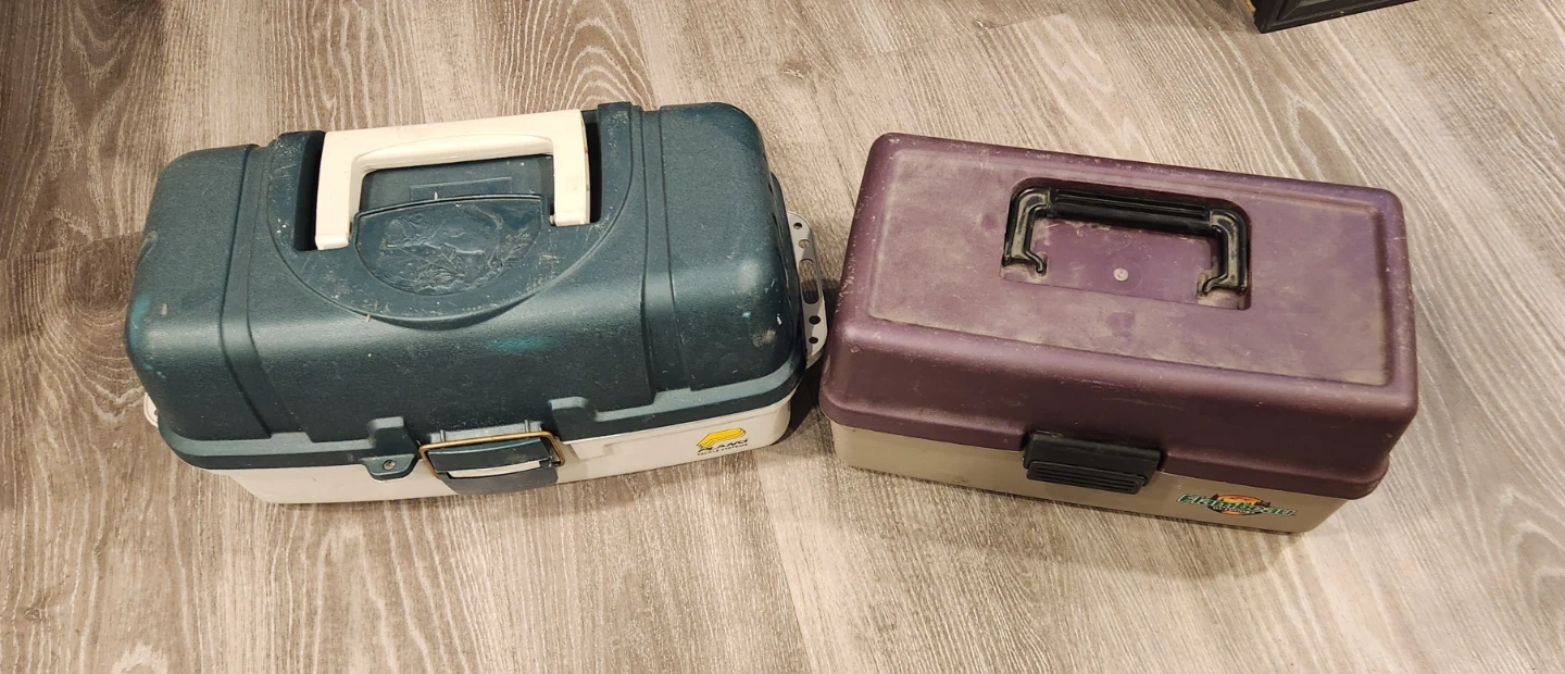 Two tackle boxes for organizing your fishing gear. One is a Plano model in green and white with multiple trays. The other is a Flambeau model in purple and tan, also with divided compartments. Great for keeping your lures and tackle sorted!