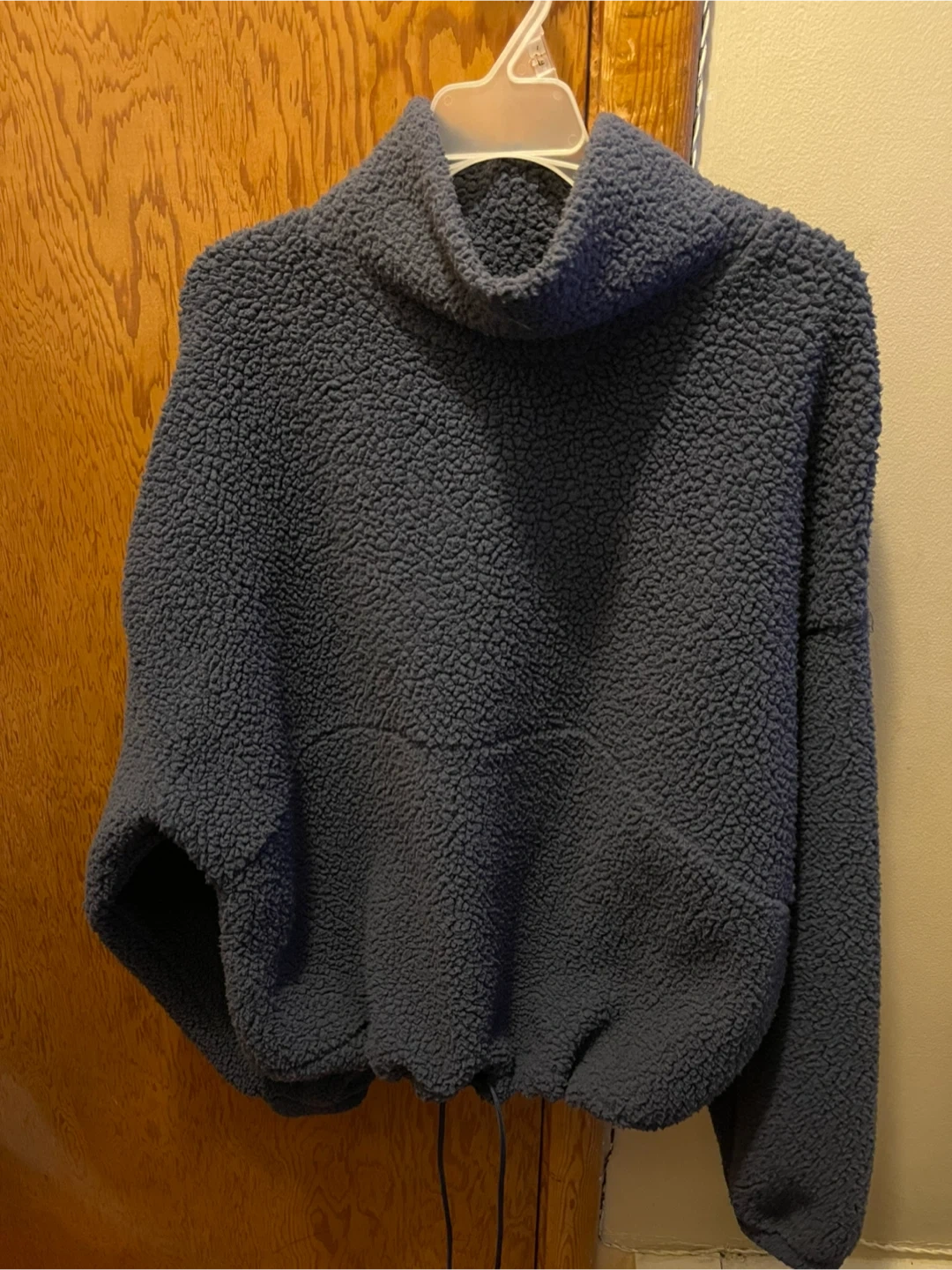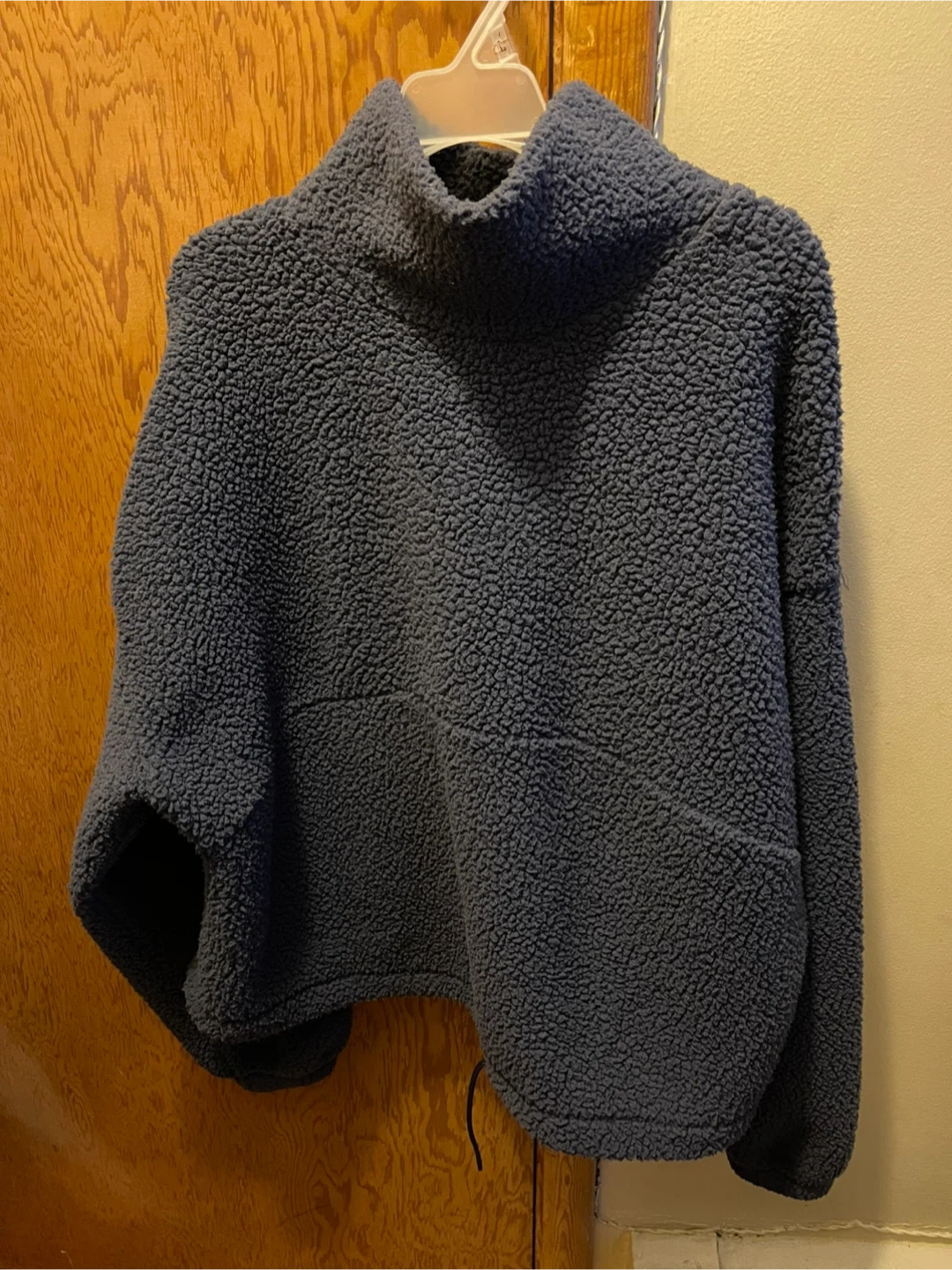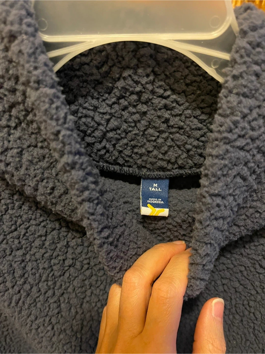 Cozy up in this navy blue fleece pullover. It's a size M Tall oversize with a mock neck design. The material is soft and perfect for cooler weather!