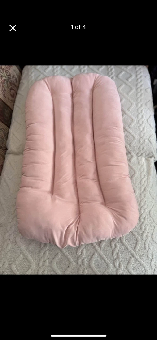 Soft pink baby lounger. It's made of a plush material for comfort. This lounger is perfect for tummy time or supervised naps.