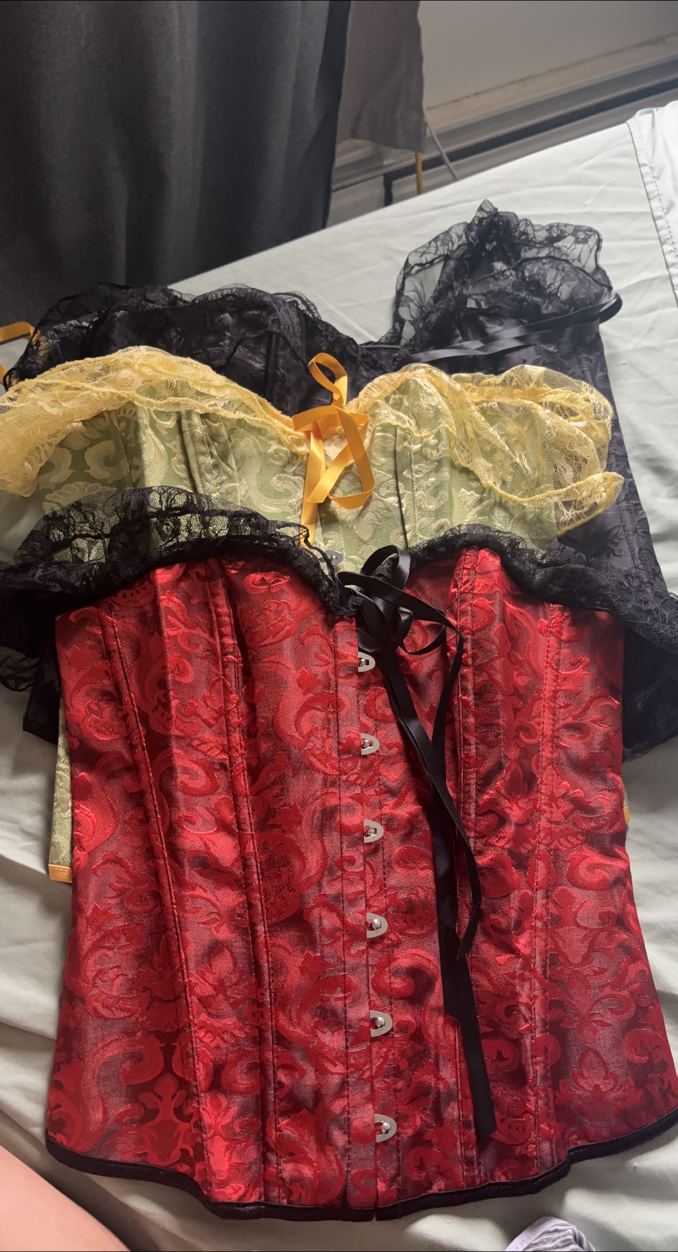60Selling a set of off-shoulder corset tops in red, green, and black. They're in great condition and ready for a new home! Perfect for adding a touch of elegance to any outfit bought them 20 each you can get them for $40 cash only Rfs don’t fit me it’s large