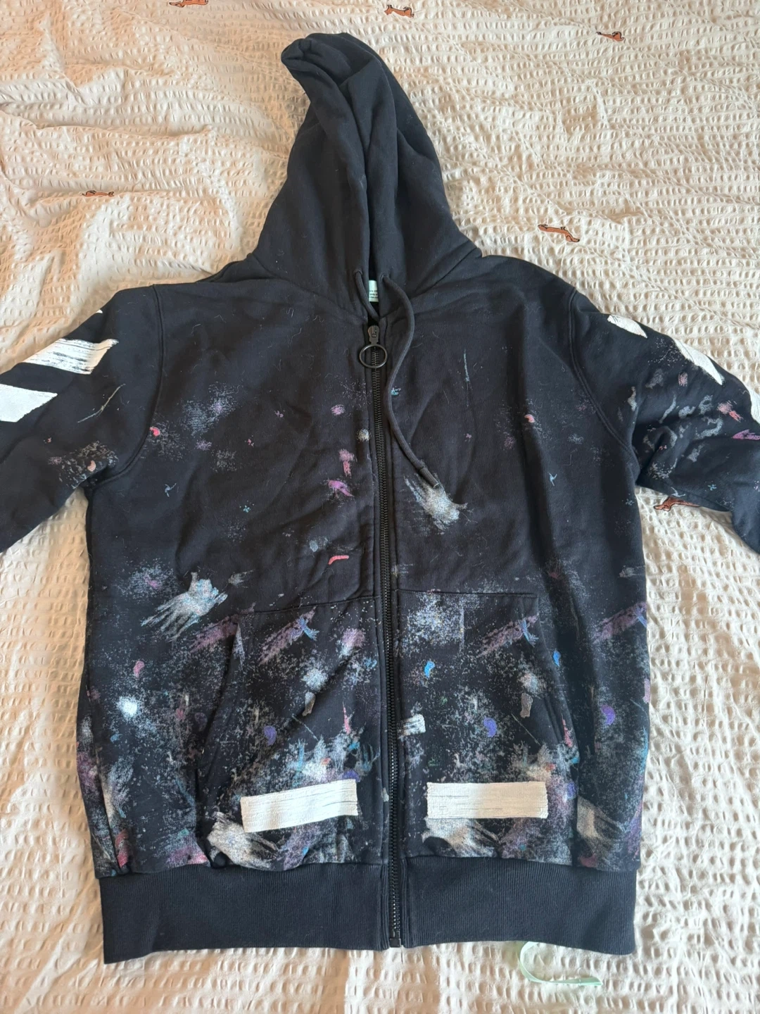 10Selling a used Off-White hoodie in black. It features the signature Off-White arrow design on the back and stripes on the sleeves. There are some paint splatter details throughout the hoodie. Please check the photos for condition