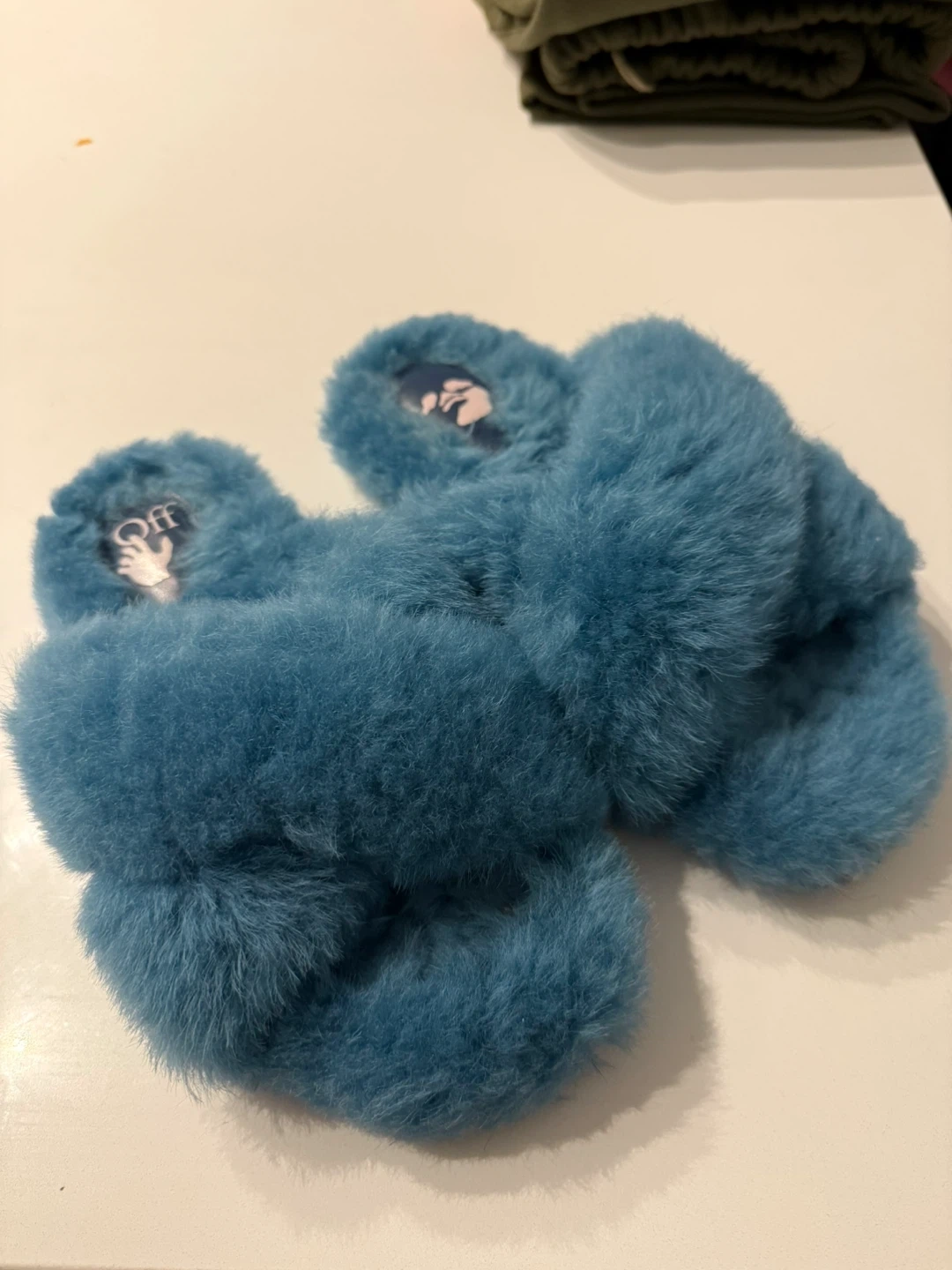10Selling a pair of Off-White furry slippers in a lovely blue colour! They are super comfy and stylish. Perfect for lounging around the house or adding a touch of fun to your outfit. Check out the photos for details!