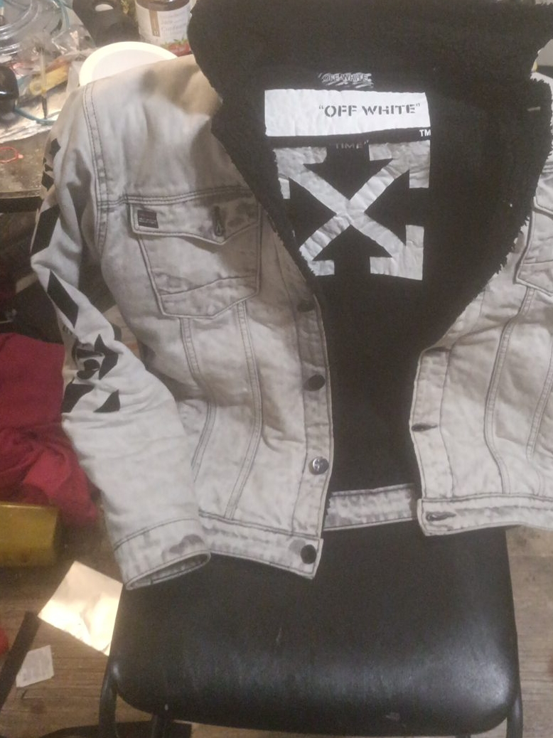 Selling a stylish Off-White denim jacket. It features the iconic Off-White logo and design. The jacket is in great condition and ready for a new home!