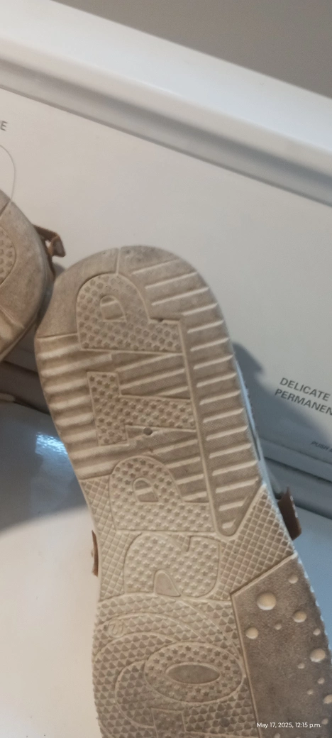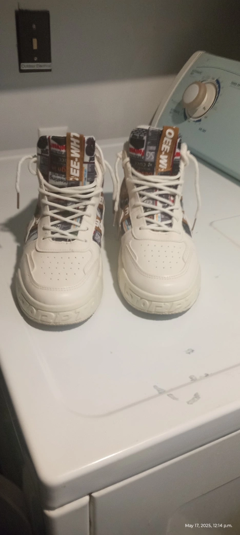 Pair of off-white high top sneakers. Features brown accents and Off-White inspired print. Lace-up closure. Thick sole.