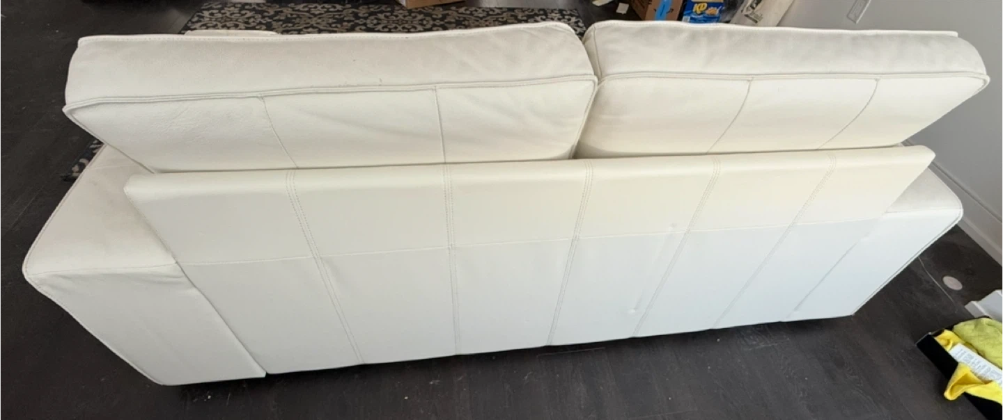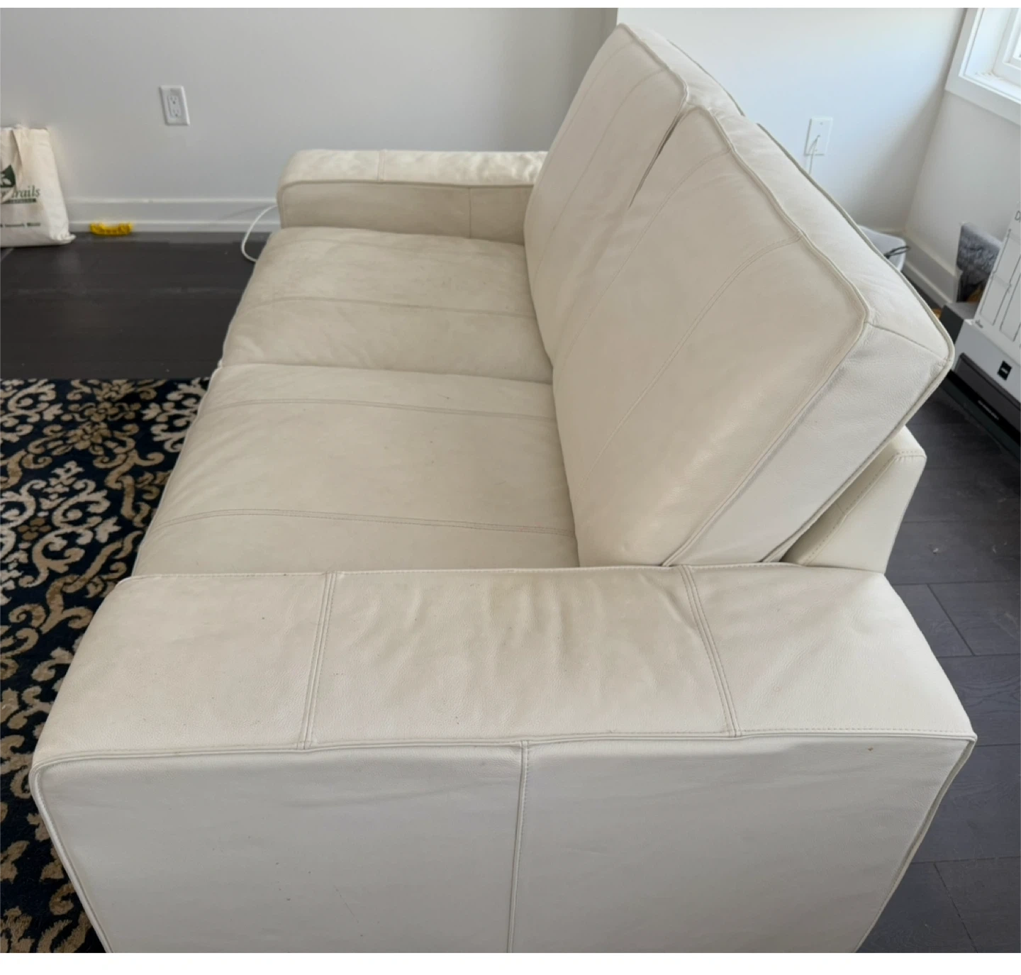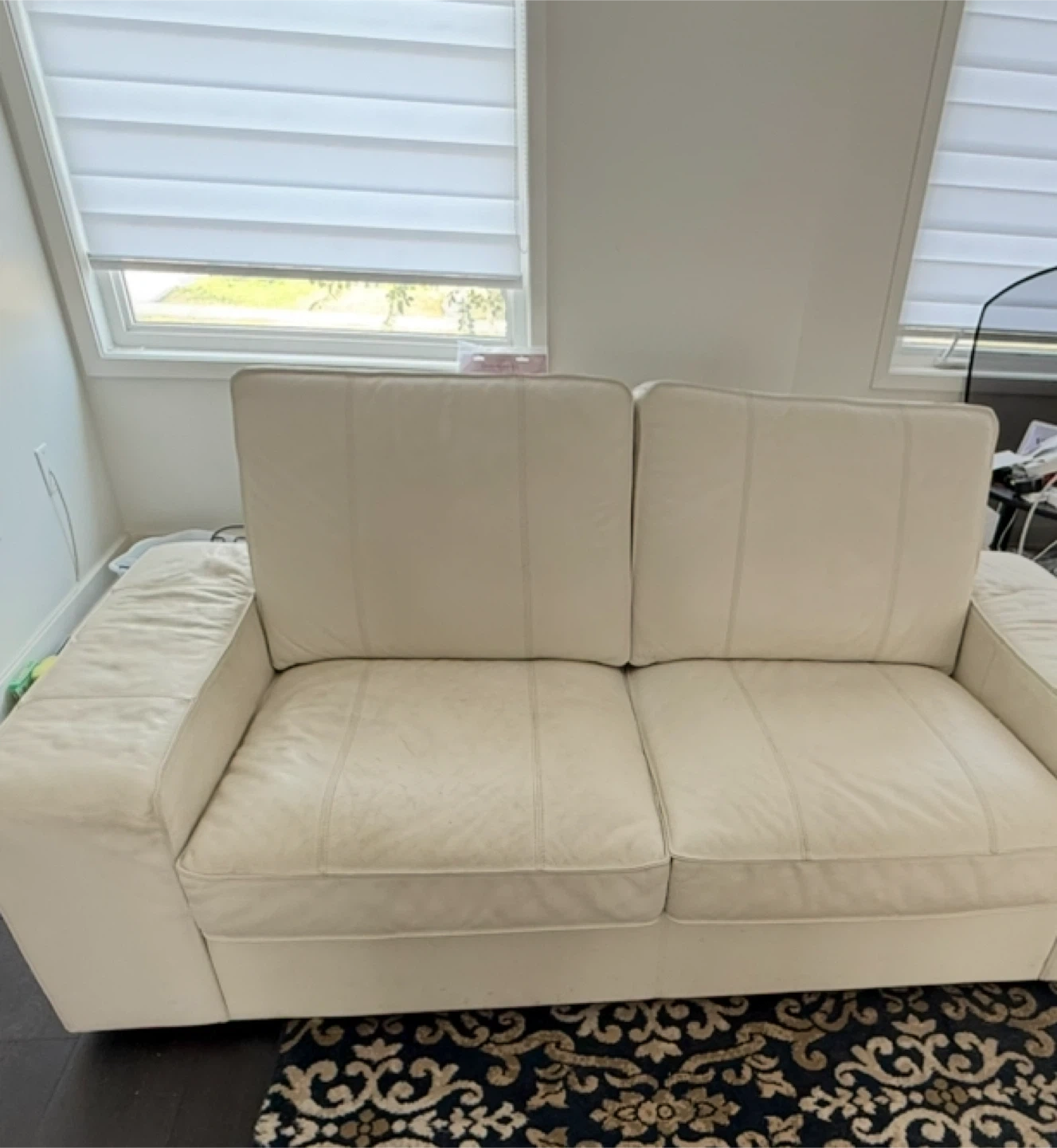 0Selling a off white leather sofa. It's a stylish piece that could add a touch of elegance to any living space. It shows some signs of use, but it's still in good condition for its age. Please take a look at the photos to see the condition for yourself!