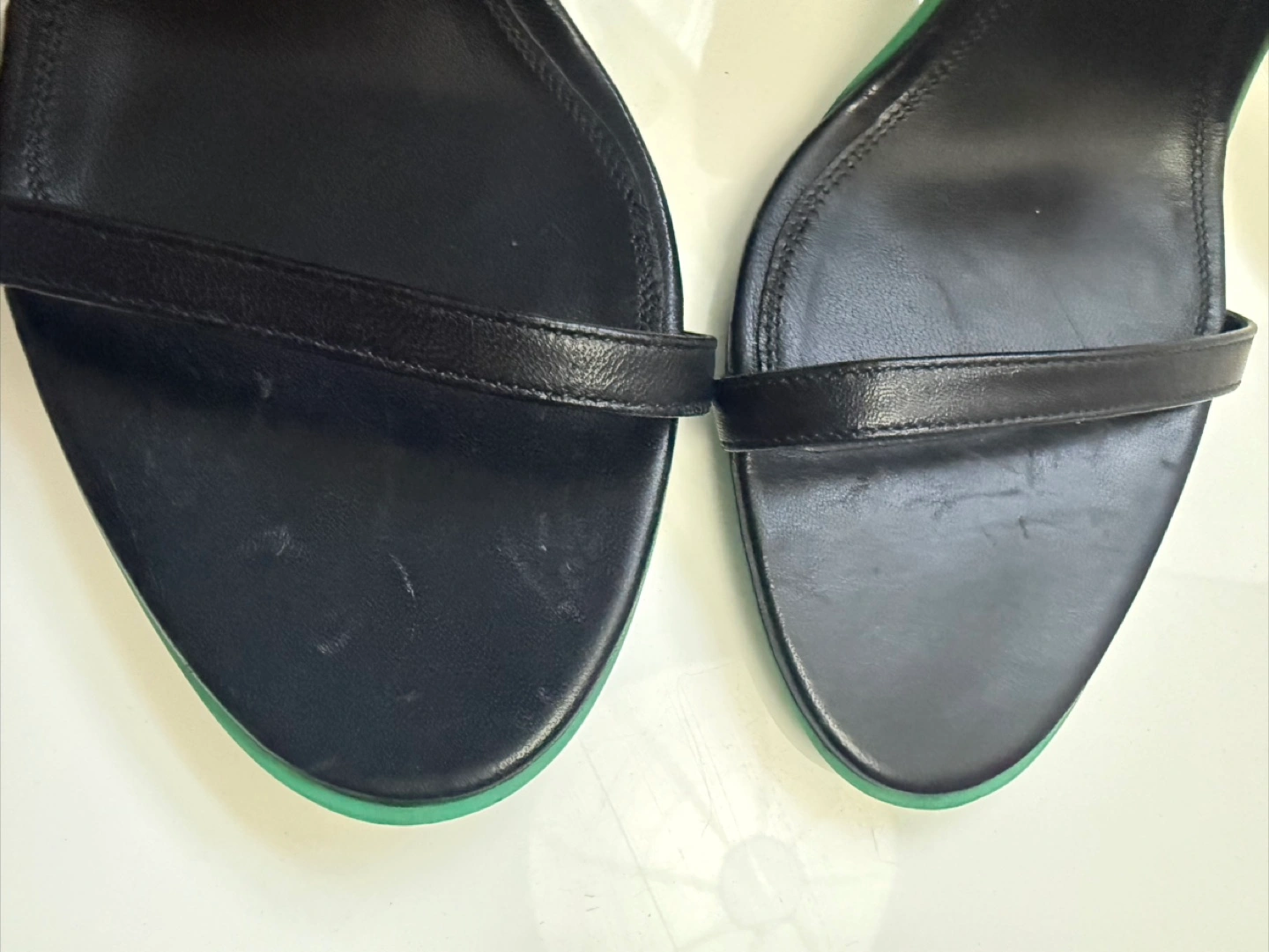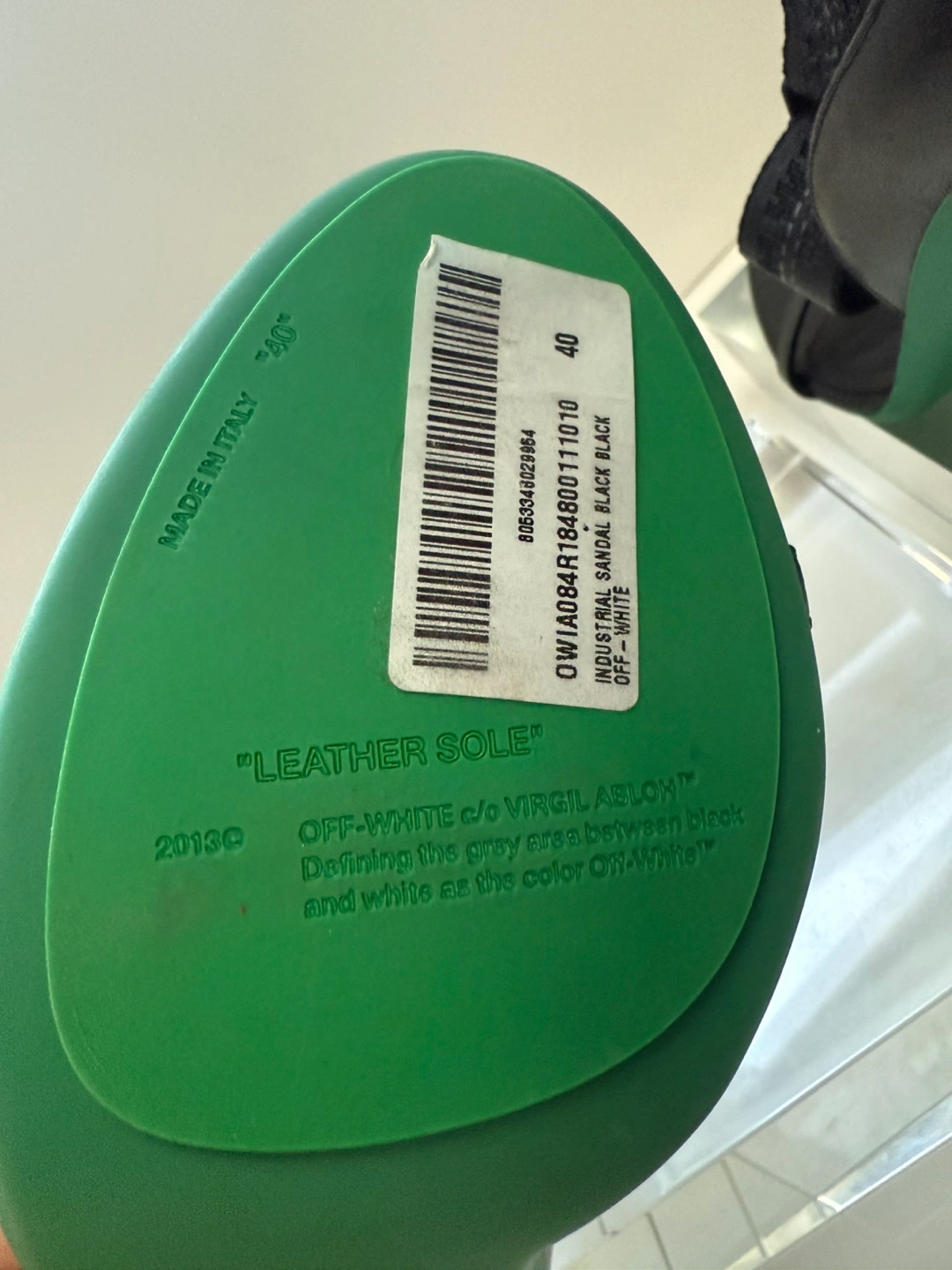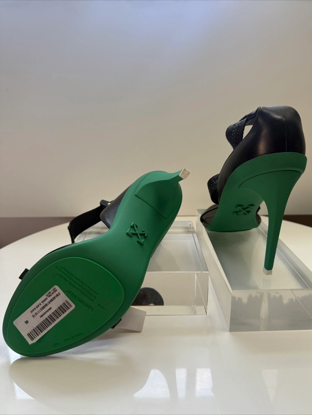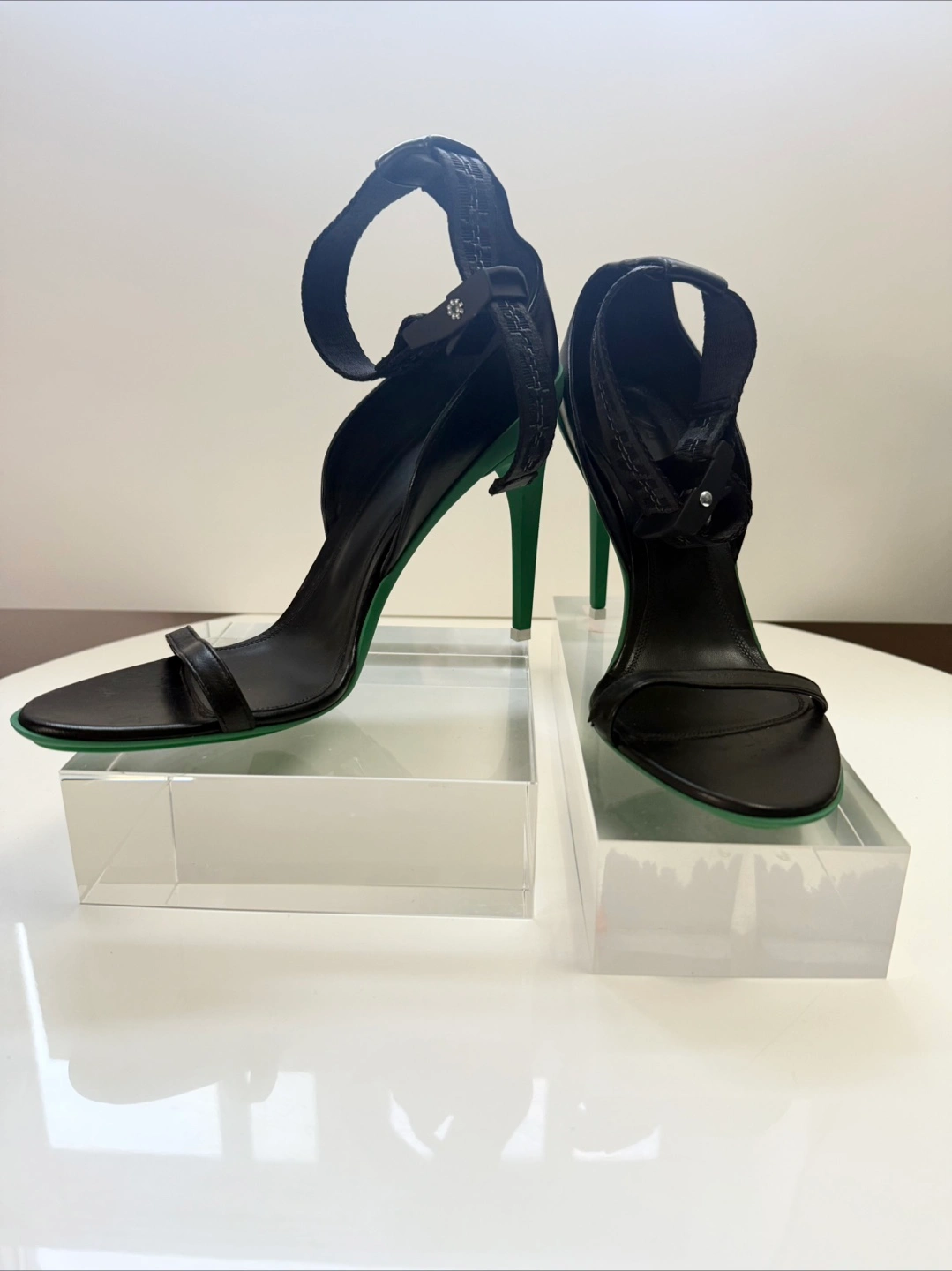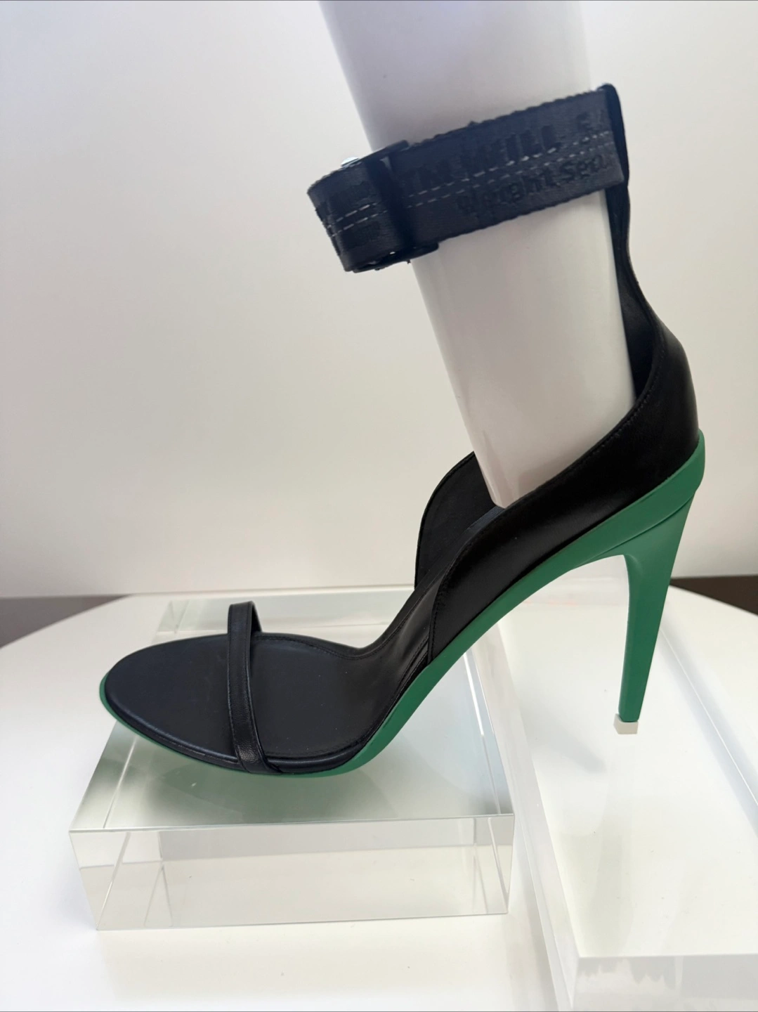 10Virgil Abloh era sandal heels with iconic industrial buckle fastening at heels. Size 10. New condition with some minor scuffing at vamp area.