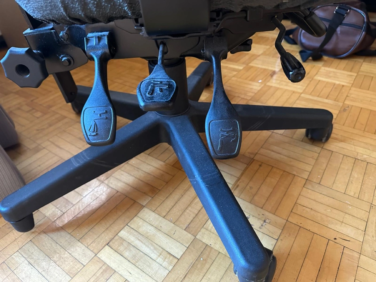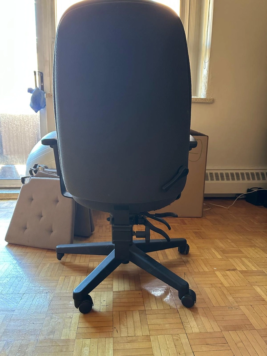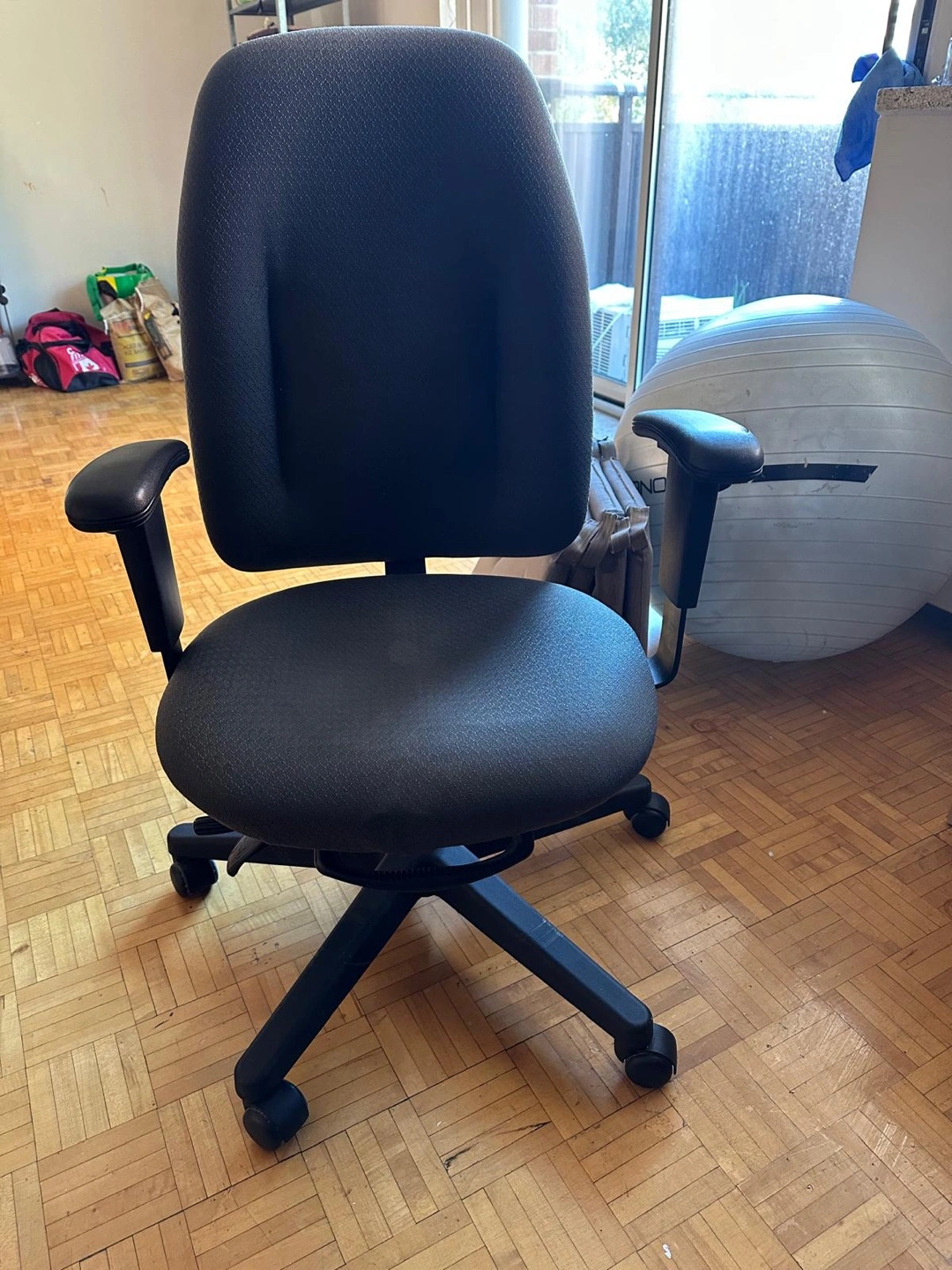Black office chair with adjustable height and armrests. Swivel base with five wheels.