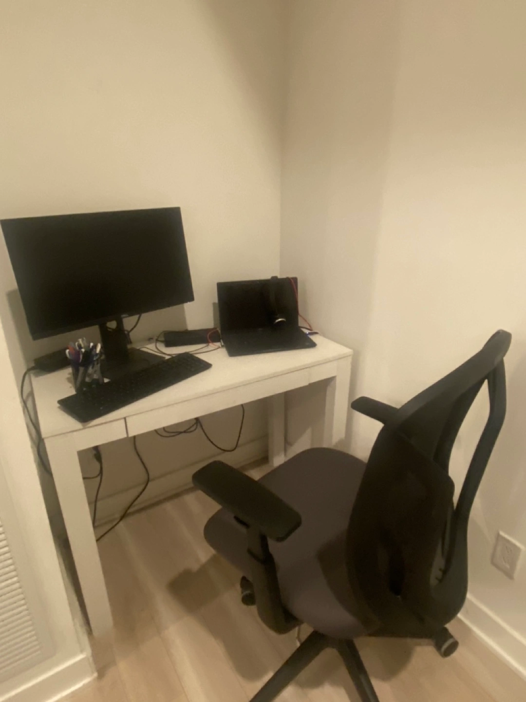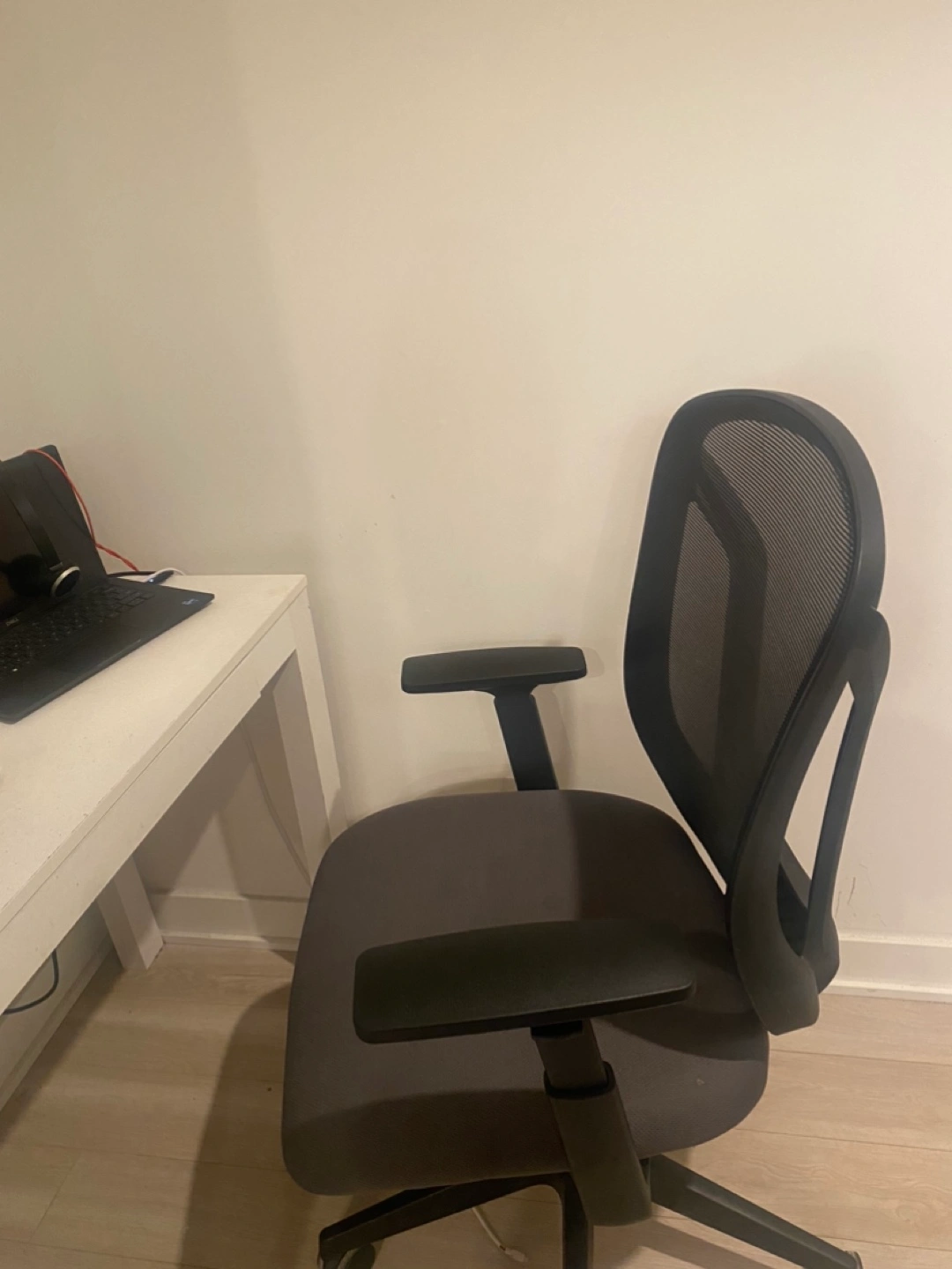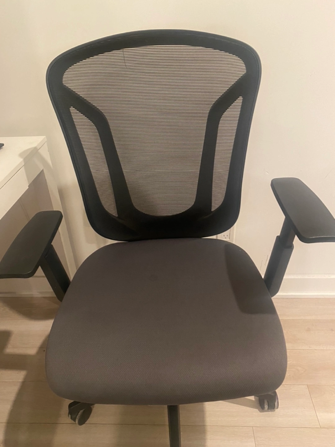 16Comfortable office chair. Mesh back for breathability. Adjustable armrests. Dark grey fabric seat. Five-star base with rolling casters. Good condition. White Office Desk - Minor Wear. ***Computer Equipment Not Included***