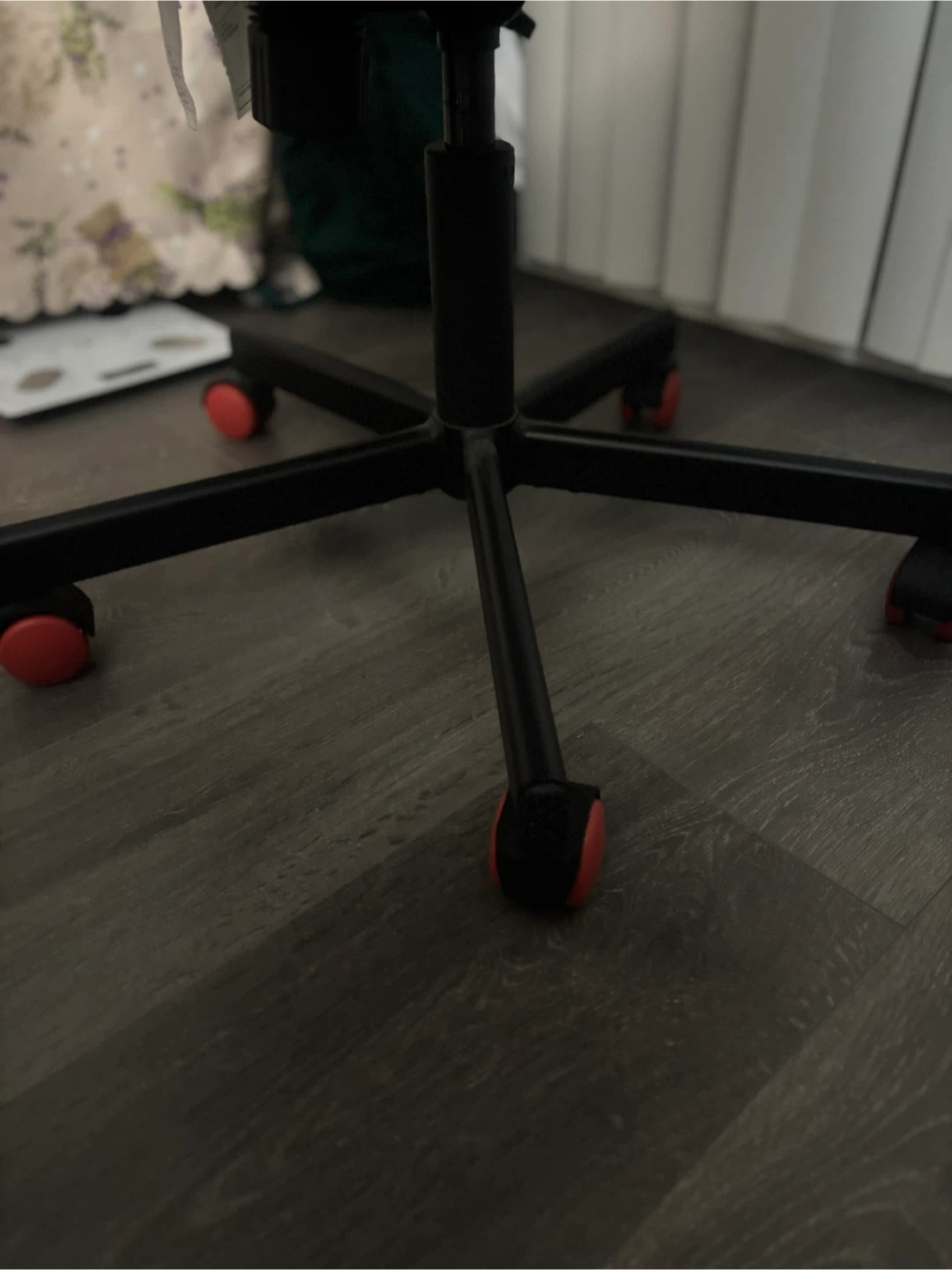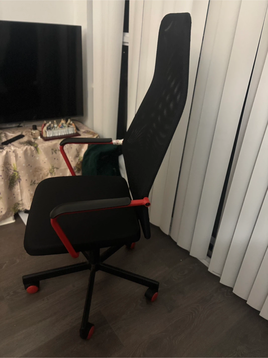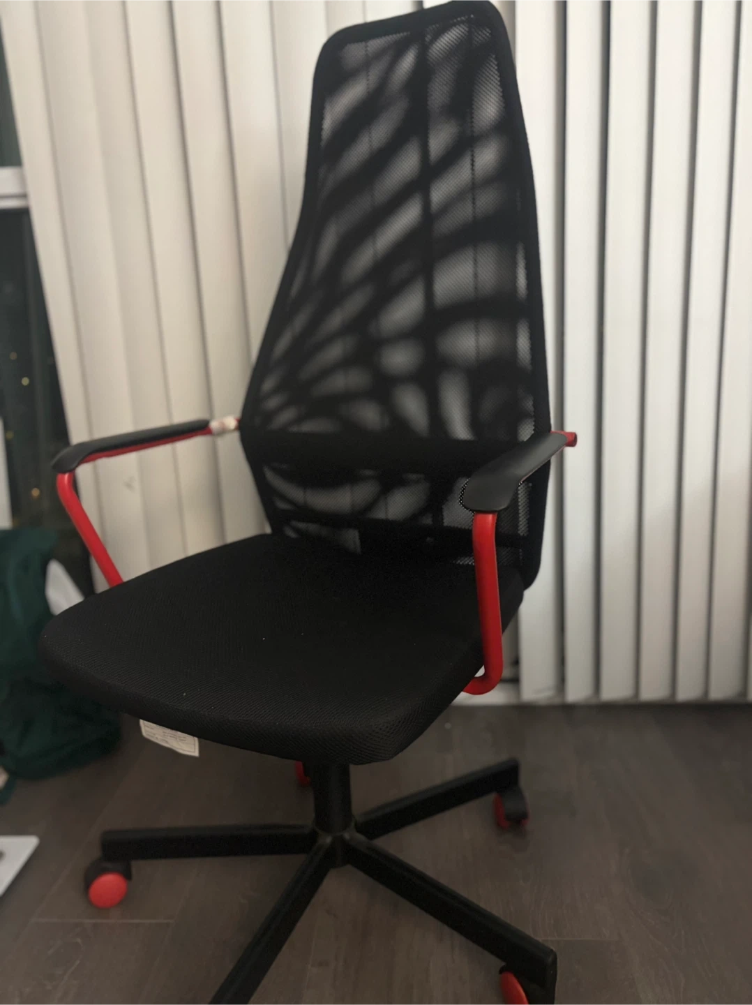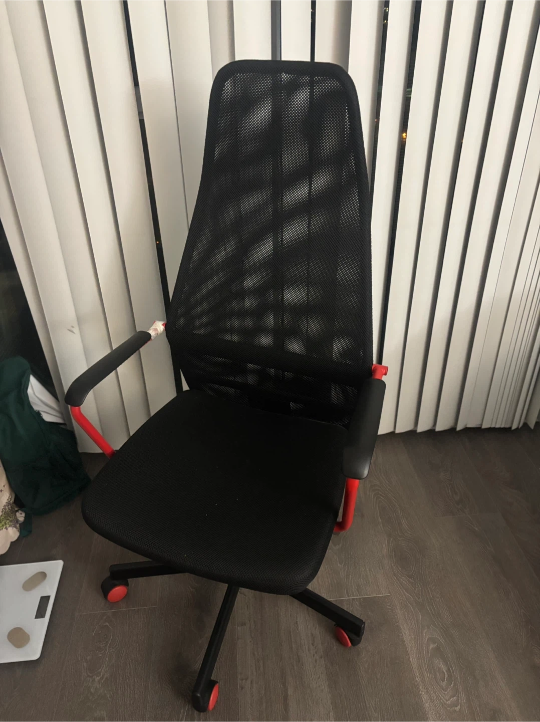 10Selling a comfortable office chair! It features a black mesh back and seat with red accents on the frame and wheels. Perfect for your home office or study space. It's in great condition and ready for a new home