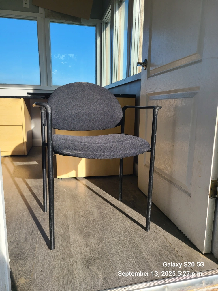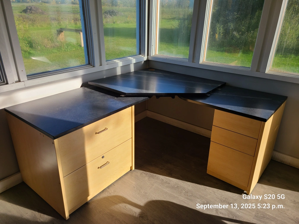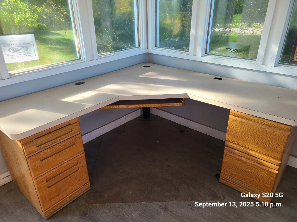 Office chair and L-shaped desk available. The chair is black with a metal frame x 6. One desk has a dark top and light wood drawers. Second desk light wood. Perfect for a home office setup!