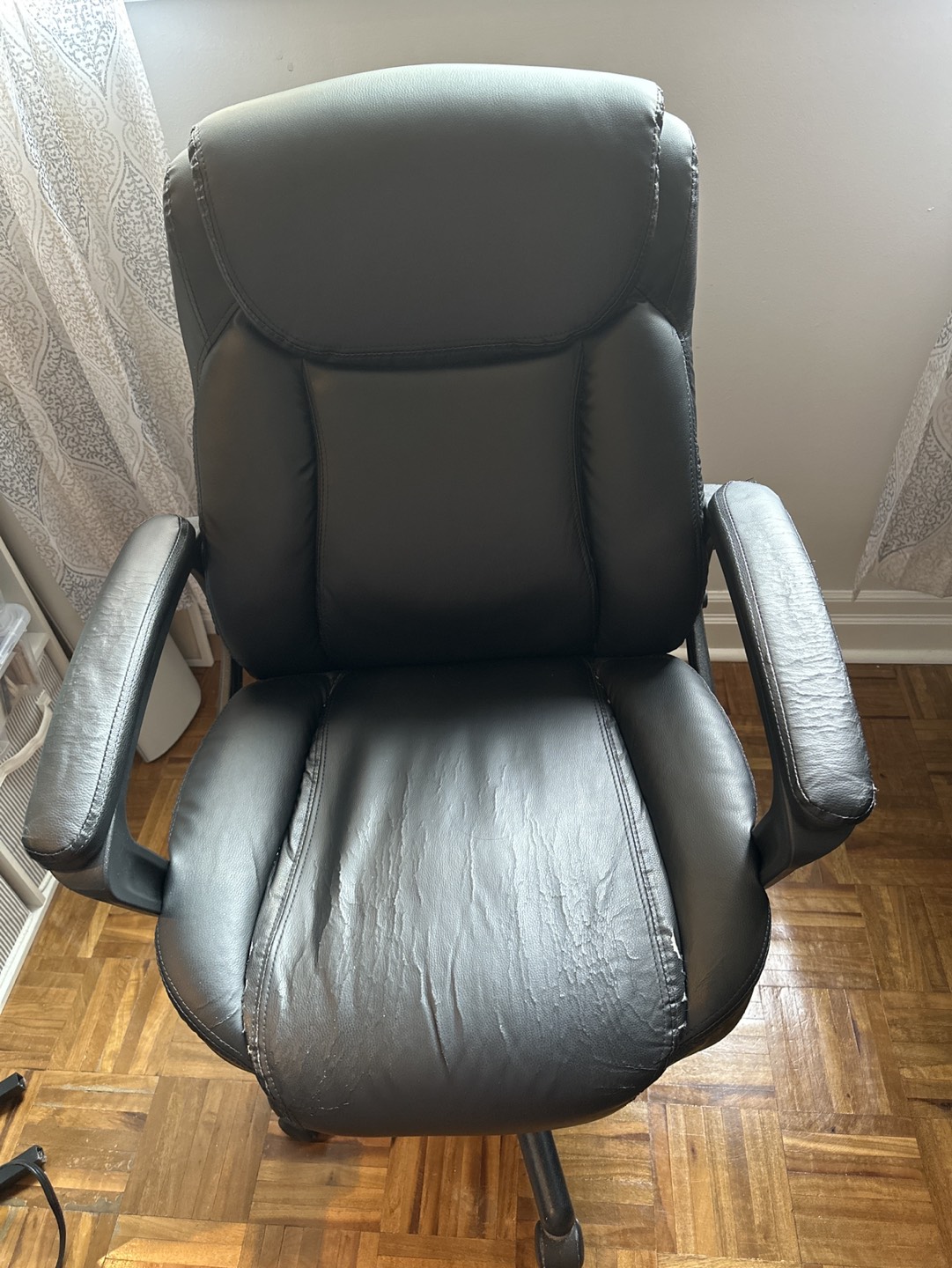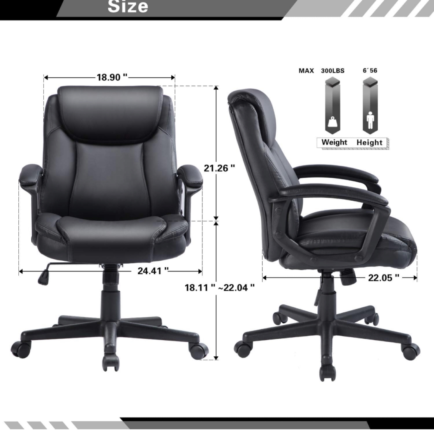 37Spring Cushion Mid Back with Arms PU Leather 360 Swivel If you are looking for a computer desk chair at home or office, this leather office chair may be your best choice. It can hold 300lbs for max weight, breathable spring cushion design for more comfort, and chair wheels are super smooth for movement. Meanwhile the high resilience foam and ergonomic design can support you hours of working with no fatigue.
