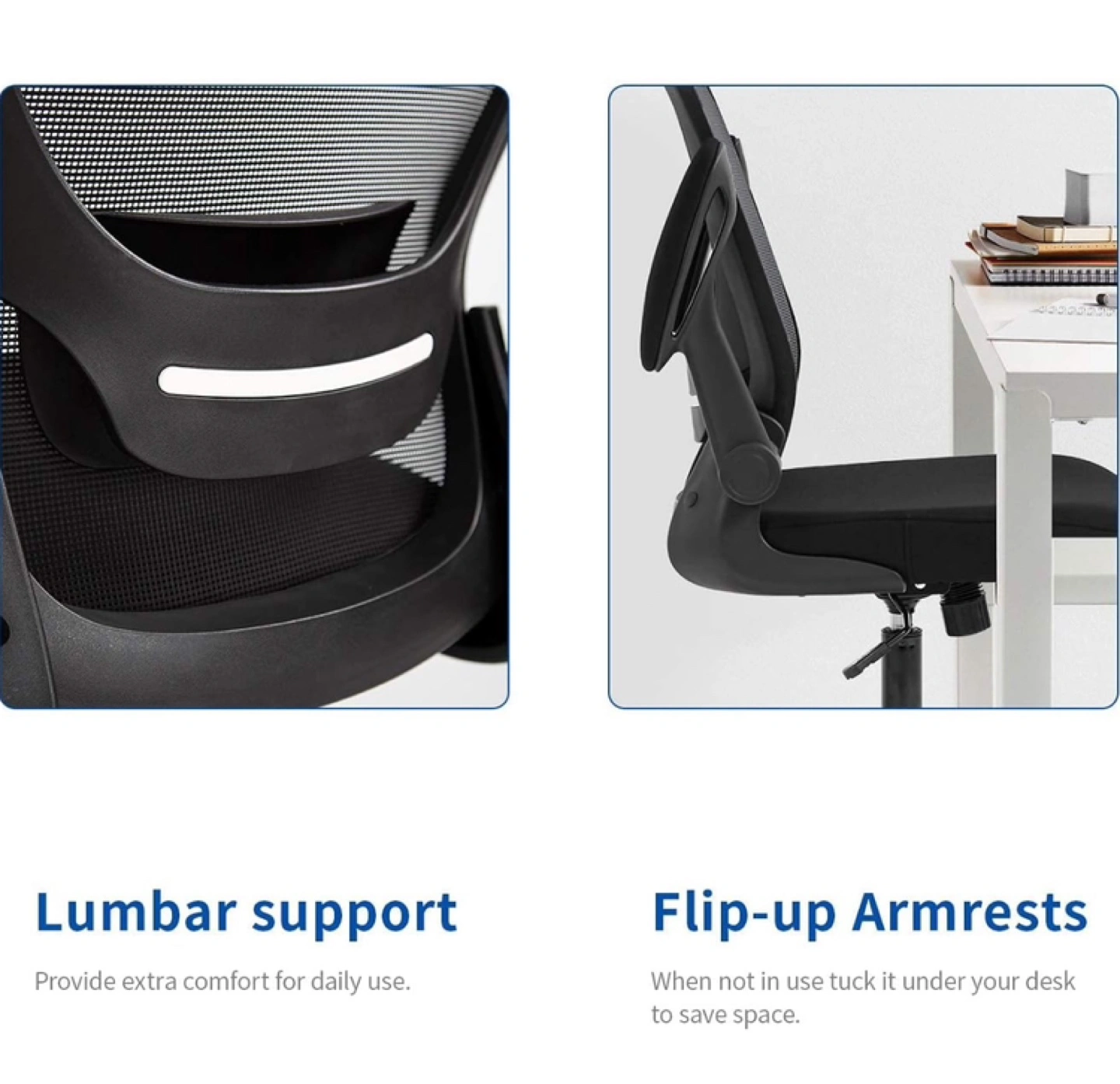 Black mesh office chair. Features lumbar support, flip-up armrests, and 90-120° tilt reclining. Adjustable tilt tension. Excellent for home or office use. Durable and comfortable.