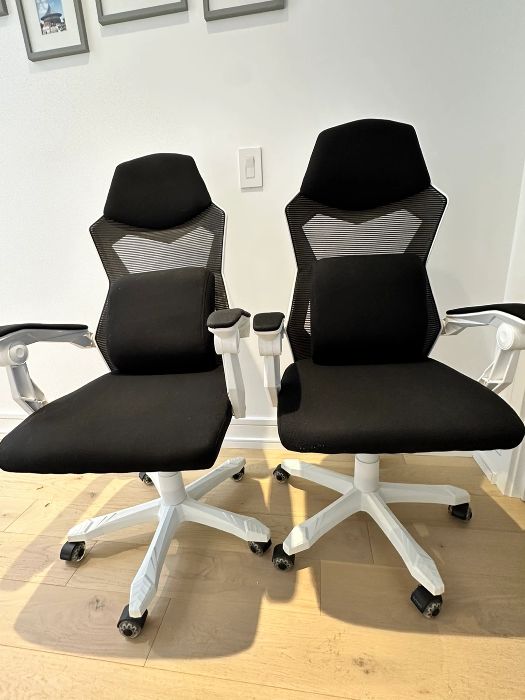 53Selling two office chairs. They are in great condition with no issues or damage- the wheels work fine and so does the rest of the mechanism. Each chair has its own lumbar pillow as well. Chairs have been steamed cleaned and disinfected