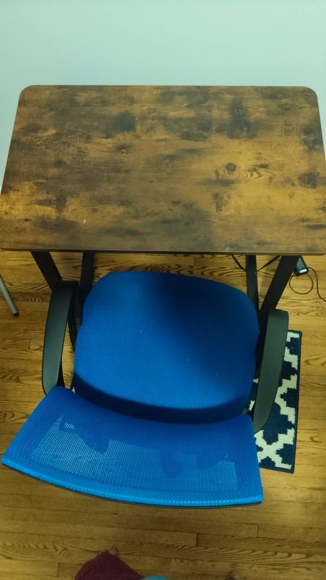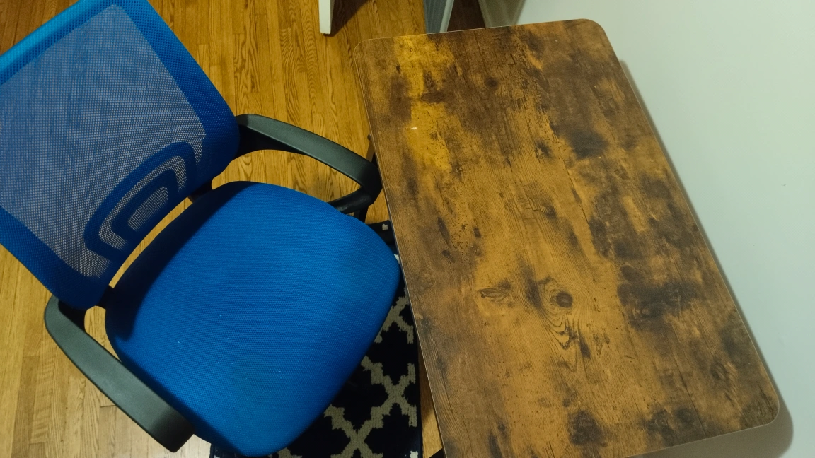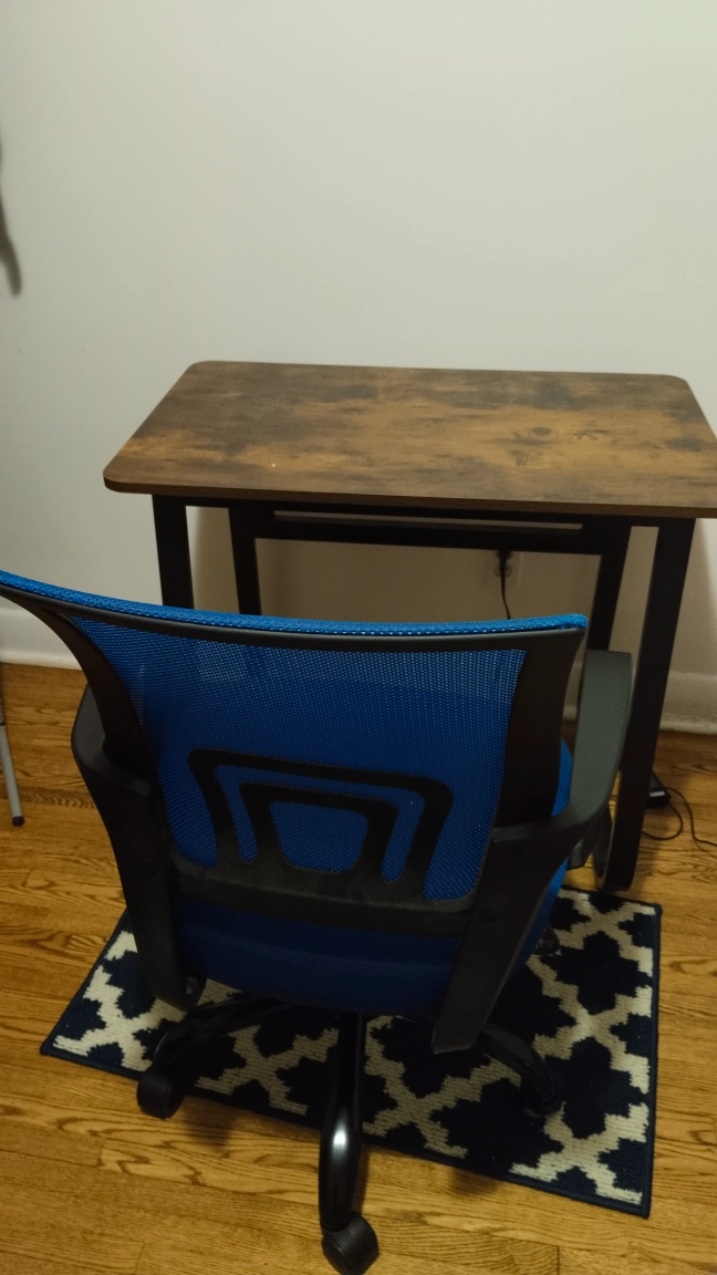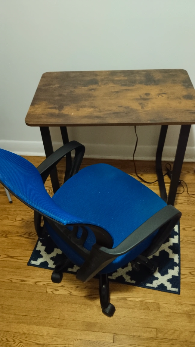 Selling a used office desk and blue mesh office chair. Both in good condition and perfect for a home office setup! The desk has a wood-look top and black metal legs. The chair is a vibrant blue mesh with black accents.