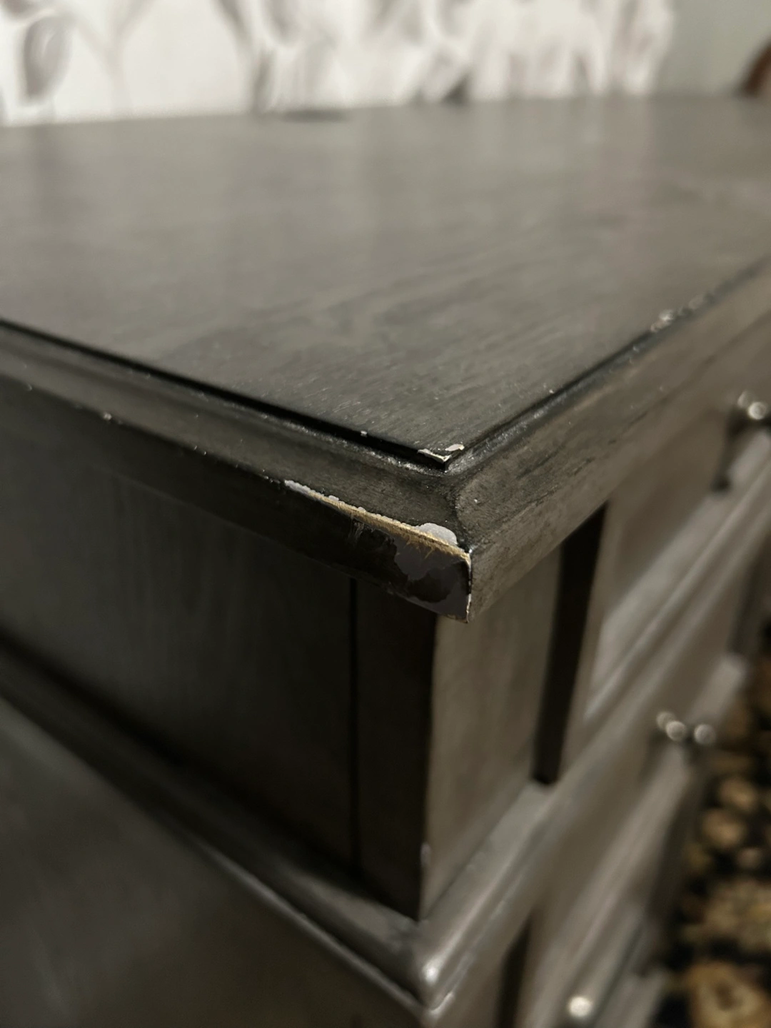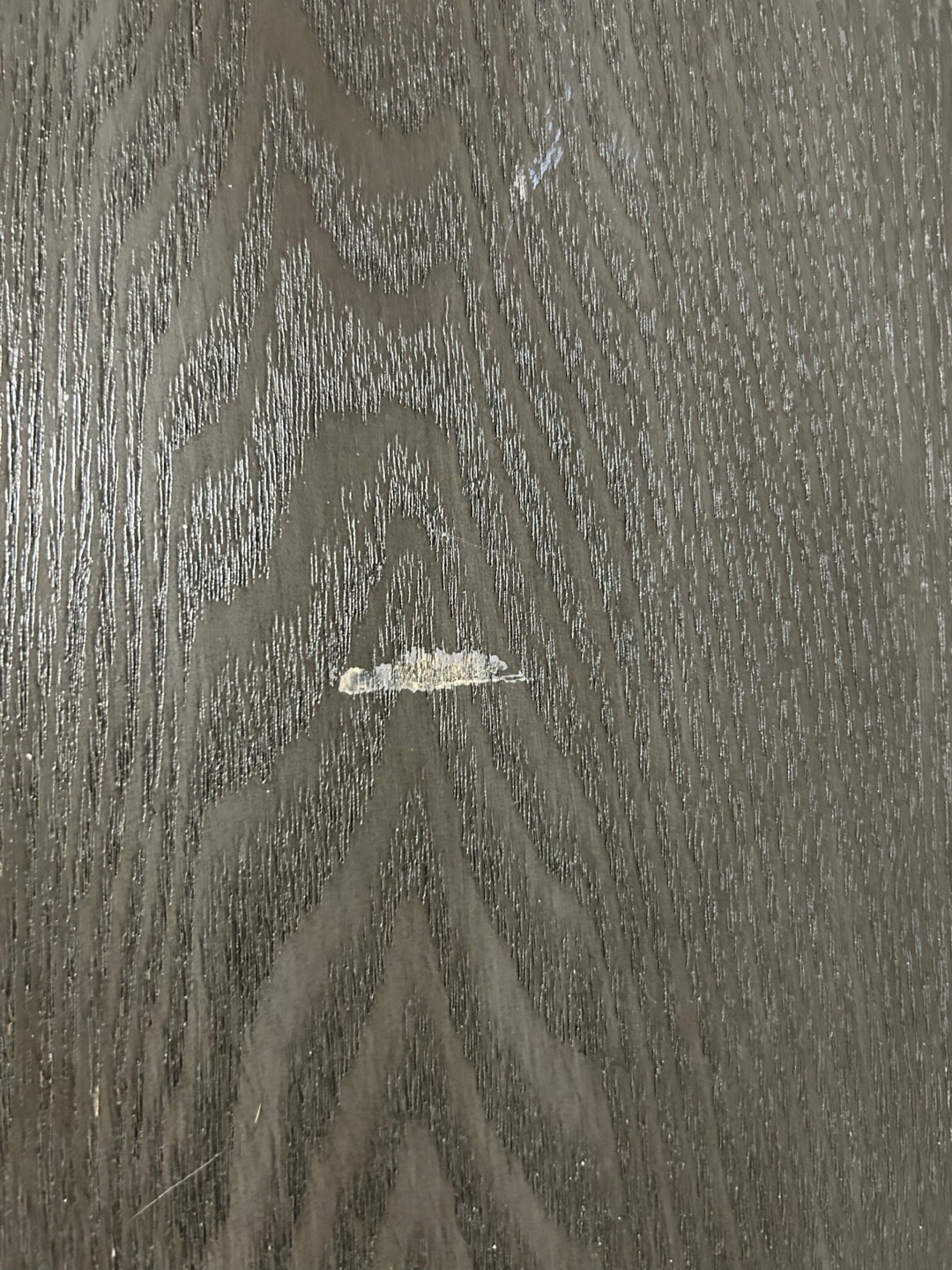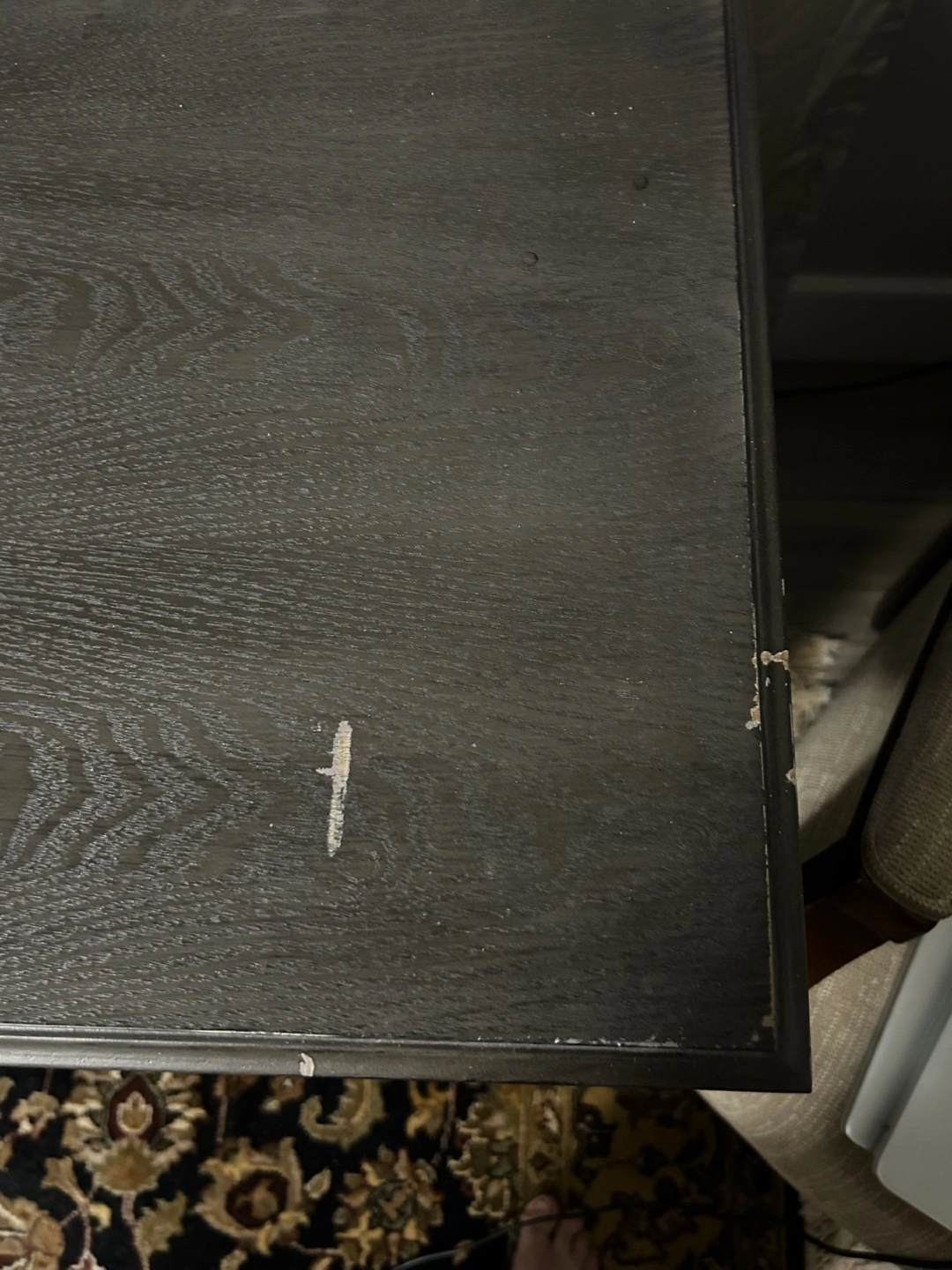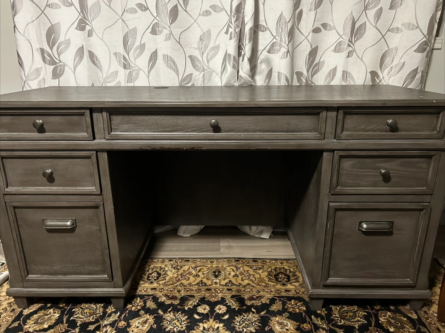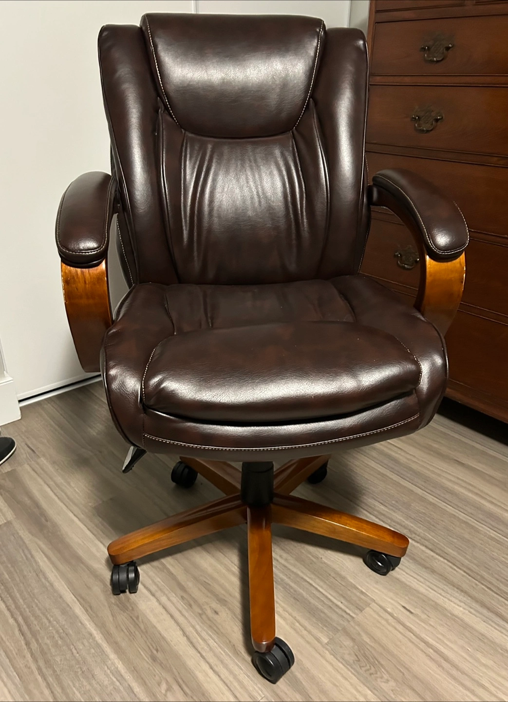 Selling a used office desk and brown leather office chair. There are some signs of wear and scratches on the desk, as shown in the photos. The chair is in good condition and very comfortable for long work days