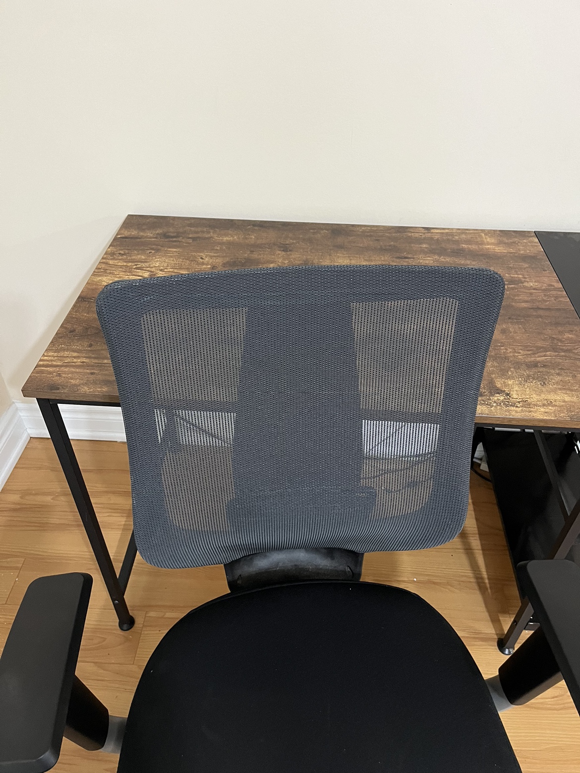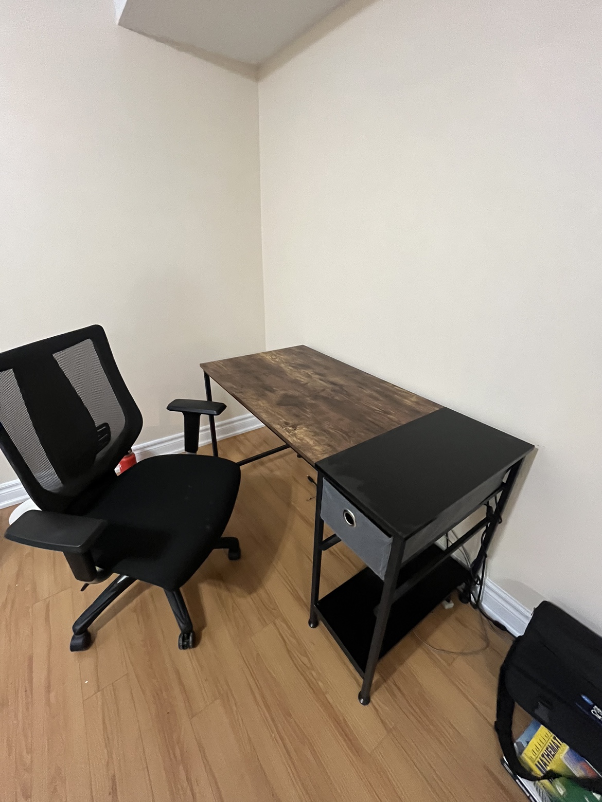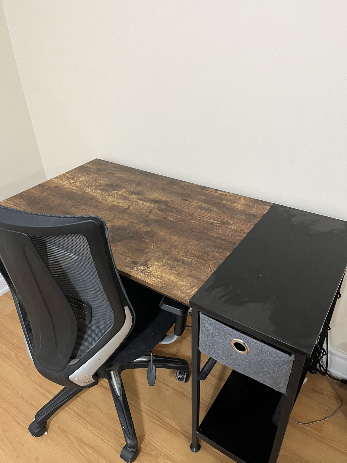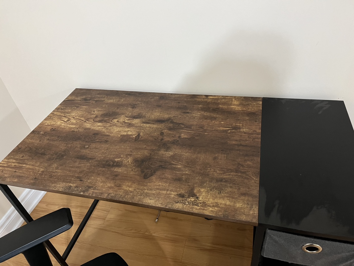10A brown and black desk with a side drawer and matching black chair. Dimensions are estimated.