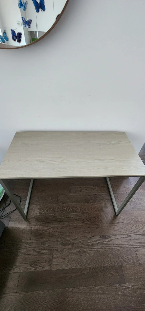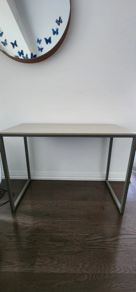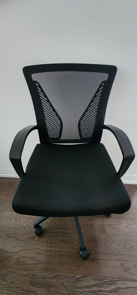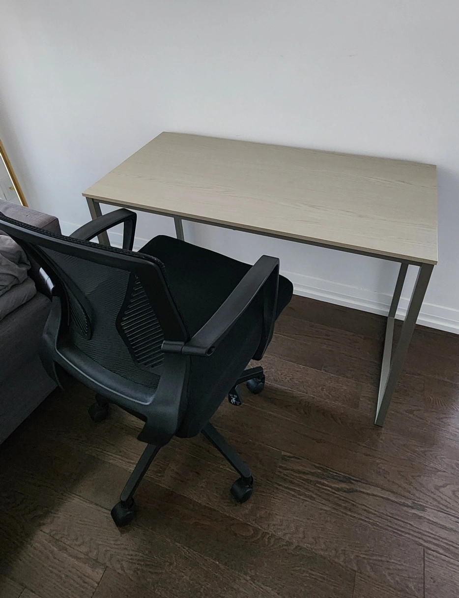 A desk and chair set that would be perfect for a small home office. The desk is a simple design with a light wood top and dark grey metal legs. The chair is black mesh with black fabric on the seat. Both Desk and Chair are in great condition. Desk is from Amazon - SHW Home Office 40-Inch Computer Desk, Maple https://a.co/d/7vNZS1d Chair is from Wayfair - https://www.wayfair.ca/furniture/pdp/inbox-zero-home-office-mesh-task-chair-c003452034.html