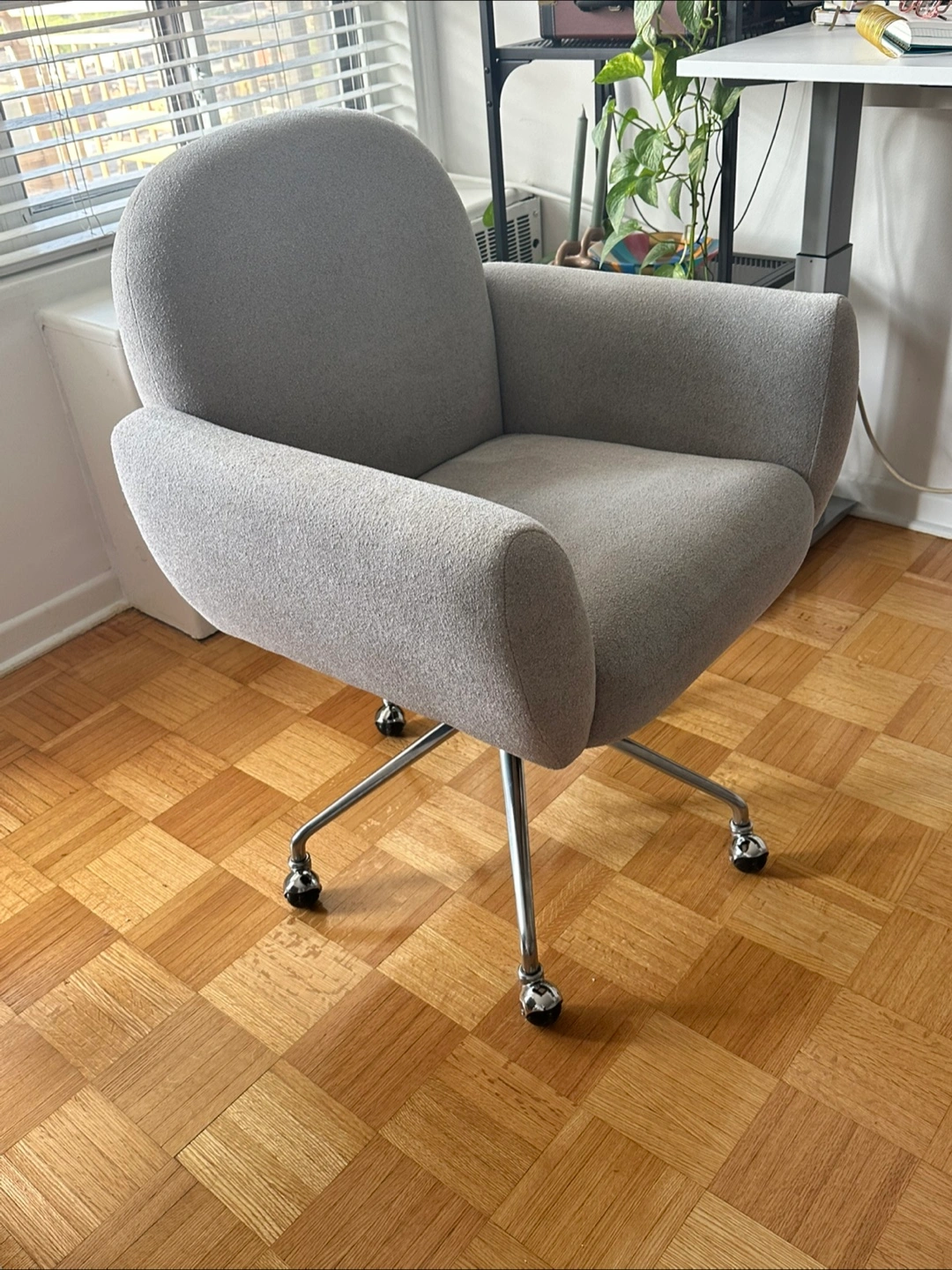 388Swivelling wheels office chair in perfect condition. Super comfortable and a unique design. Adjustable height. Dimensions: 28.5" W x 29.25" D x 34" H Pick up at St. Clair and Bathurst.