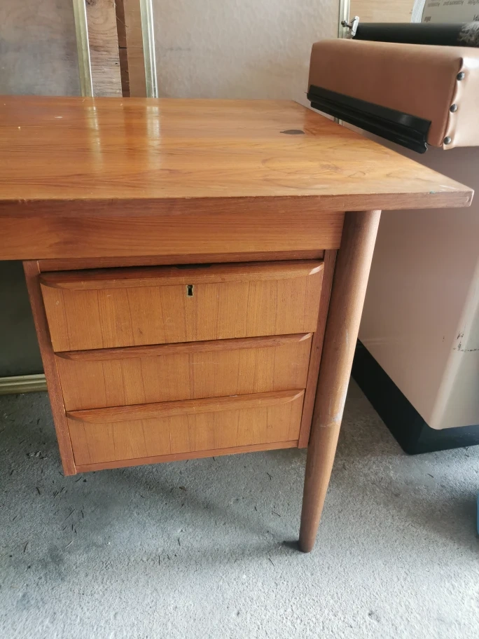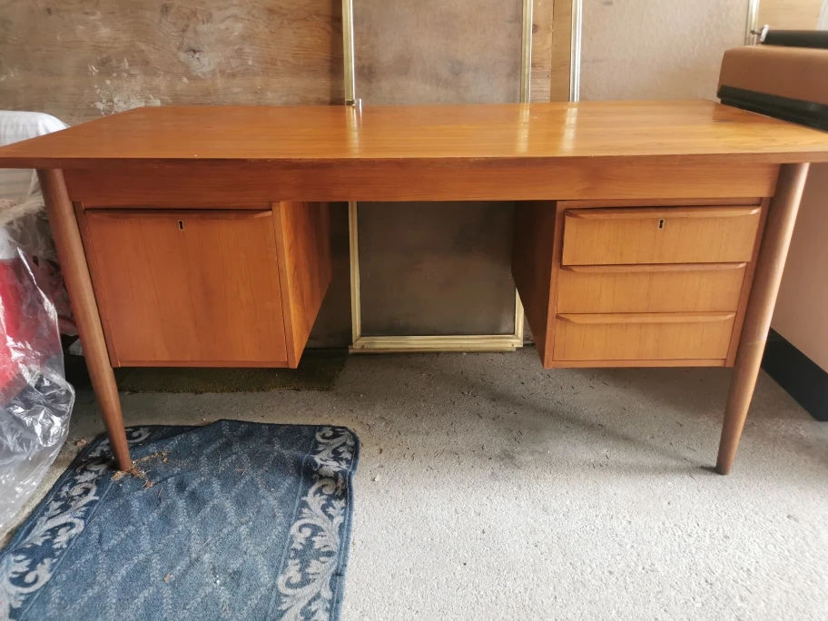 Selling a lovely vintage office desk! It has a beautiful mid-century modern design with a warm wood finish. It features drawers on both sides for ample storage. There are some signs of wear, as shown in the photos, but it's still a functional and stylish piece for your home office or workspace