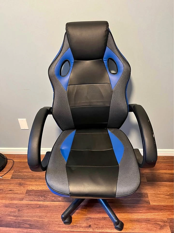 This used blue and black office/gaming chair is perfect for long hours of work or play. The chair has a race car style design. The arm rests have some cosmetic damage (pictured). Adjustable height. * Adjustable Height * Padded Arm Rests * Swivel Base $50 OBO