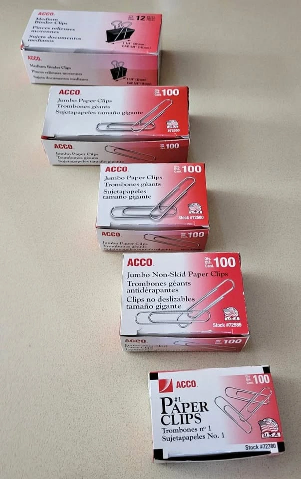 Selling a set of 5 boxes of ACCO office clips – perfect for home office, school, or business use. All boxes are brand new and unopened. Includes: 1 Box – ACCO Medium Binder Clips (12 pcs) 1 Box – ACCO Jumbo Paper Clips (100 pcs) 1 Box – ACCO Jumbo Non-Skid Paper Clips (100 pcs) 1 Box – ACCO #1 Paper Clips (100 pcs) 1 Box – ACCO Jumbo Paper Clips (100 pcs) Ideal for organizing documents, office files, or study materials. ✅ Brand New ✅ Trusted ACCO brand ✅ Great for students, teachers, and professionals