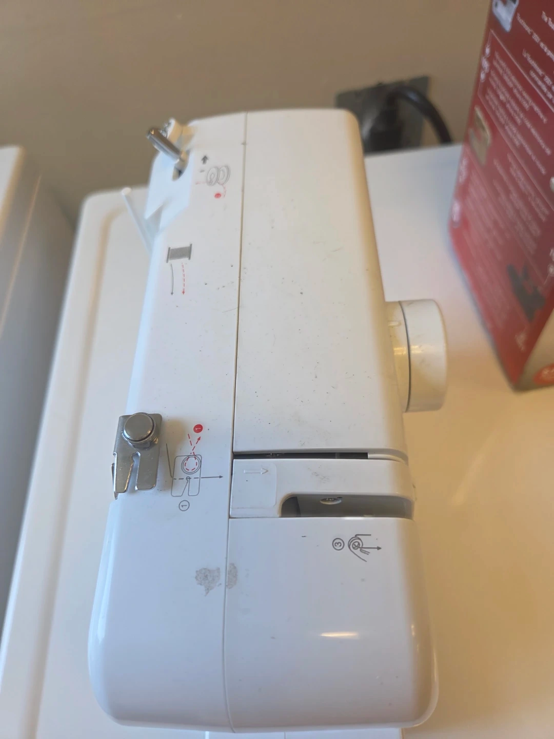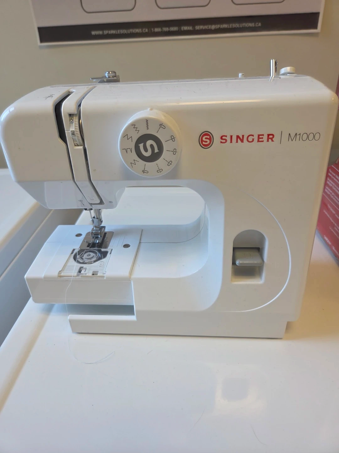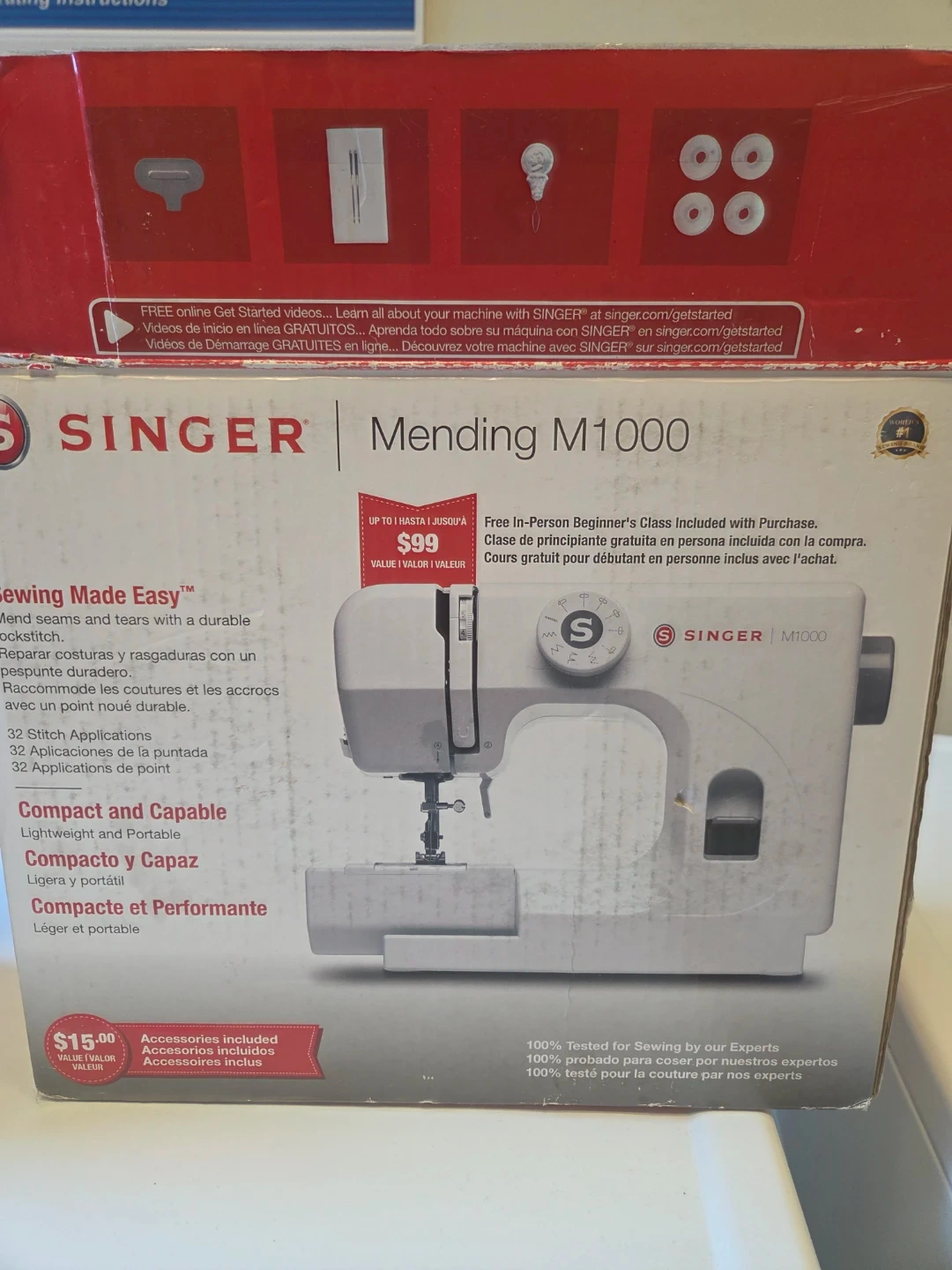 Singer Mending M1000 sewing machine. It has 32 stitch applications and is compact and portable. This machine is great for mending seams and tears with a durable stitch.