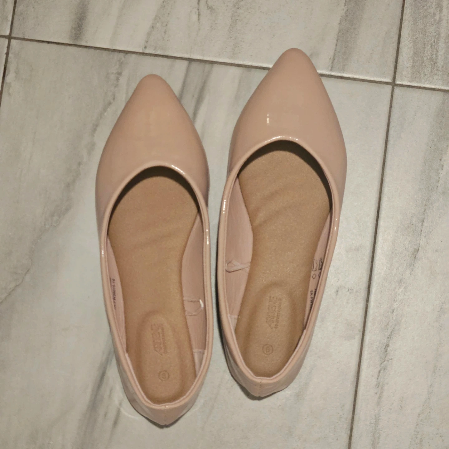 These are pink ballet flats with a pointed toe. They have a patent finish and a cushioned insole. Size is 8. Great for everyday wear!