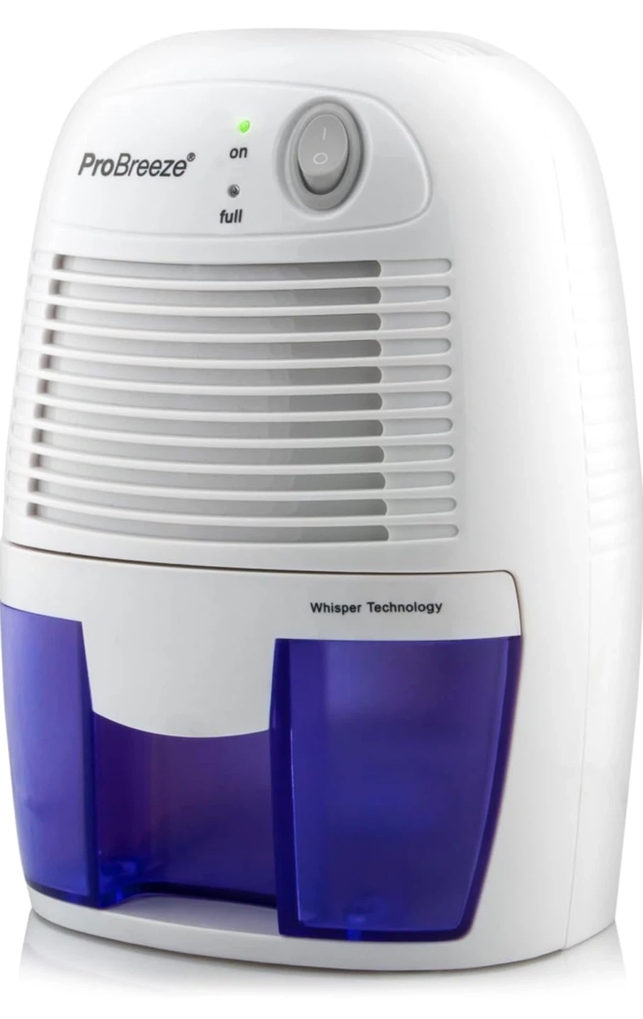 This ProBreeze dehumidifier extracts up to 9oz of water per day. It features an automatic shut-off function when the 17oz water tank is full. The unit is compact and portable, measuring 6" wide by 8.5" high. Whisper Technology is used.