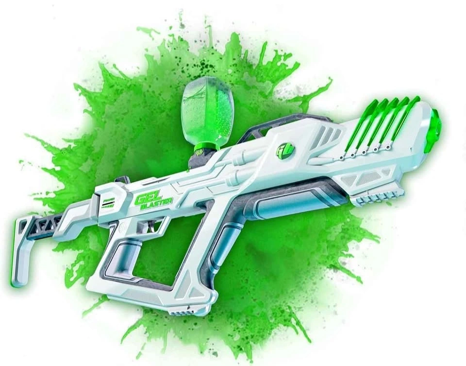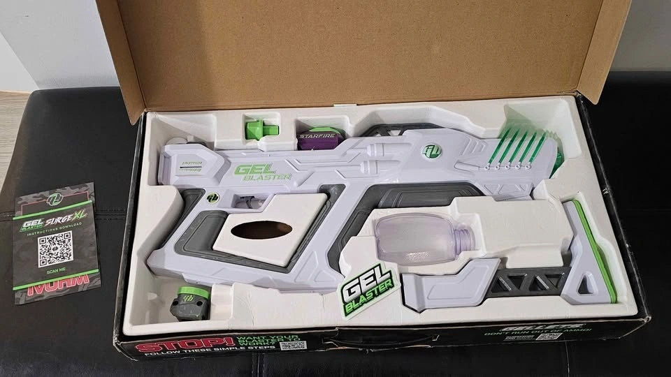 Awesome Gel Blaster Surge XL. Shoots gellets and has adjustable blaster modes: single blast, full auto, low velocity (170 FPS), and high velocity (250 FPS). Has a 150-foot range. Gellets are non-toxic, fully hydrate in 4 hours, and disintegrate on impact. Super fun and mess-free.