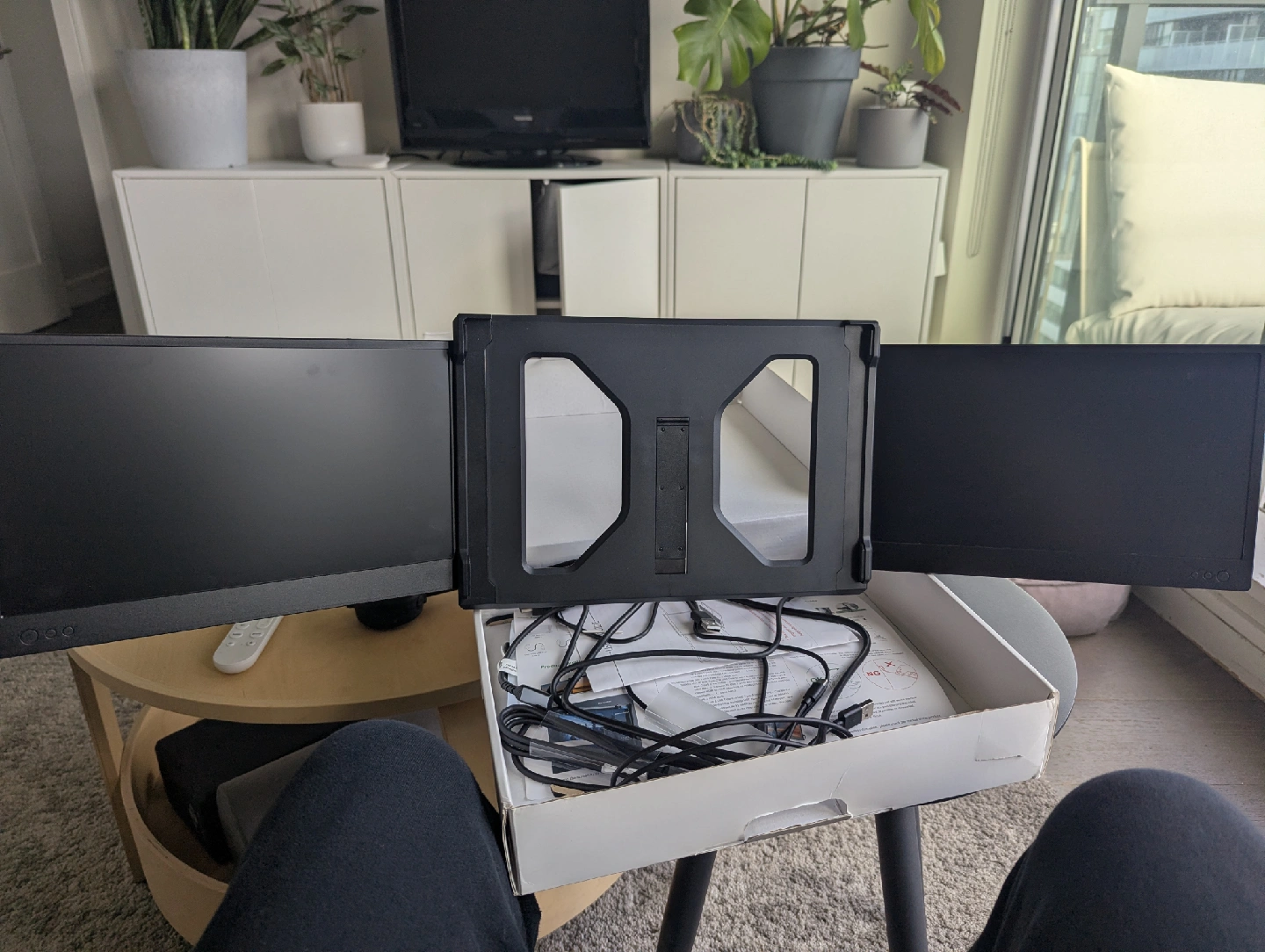Selling an OFIYAA P2 Tri Screen notebook expansion screen! It comes with the original box and all the included components. This portable monitor setup is great for increasing your productivity on the go. It's lightweight and easy to set up, making it perfect for students or professionals who need extra screen real estate. Barely used, been stored in original box since purchased.