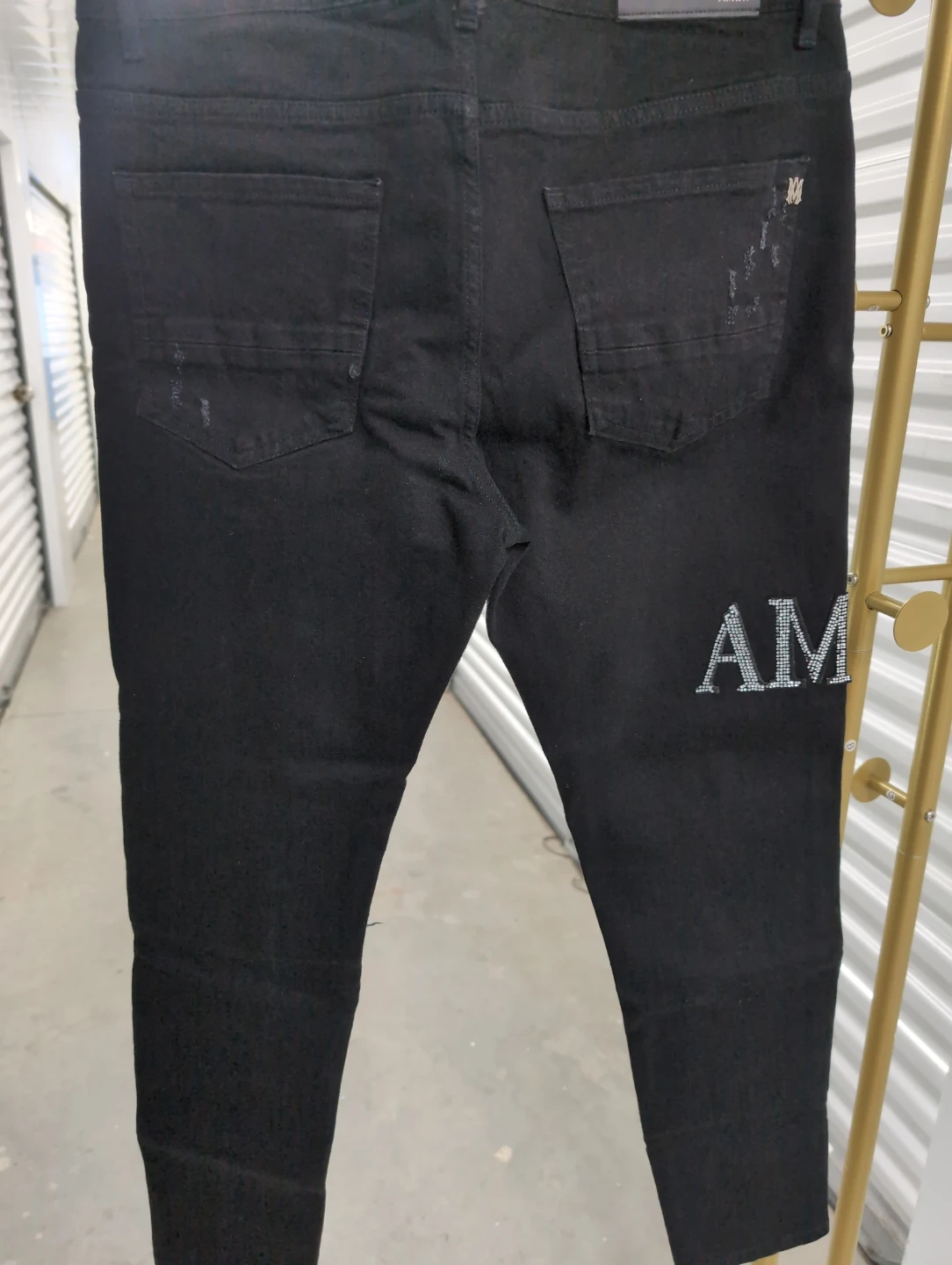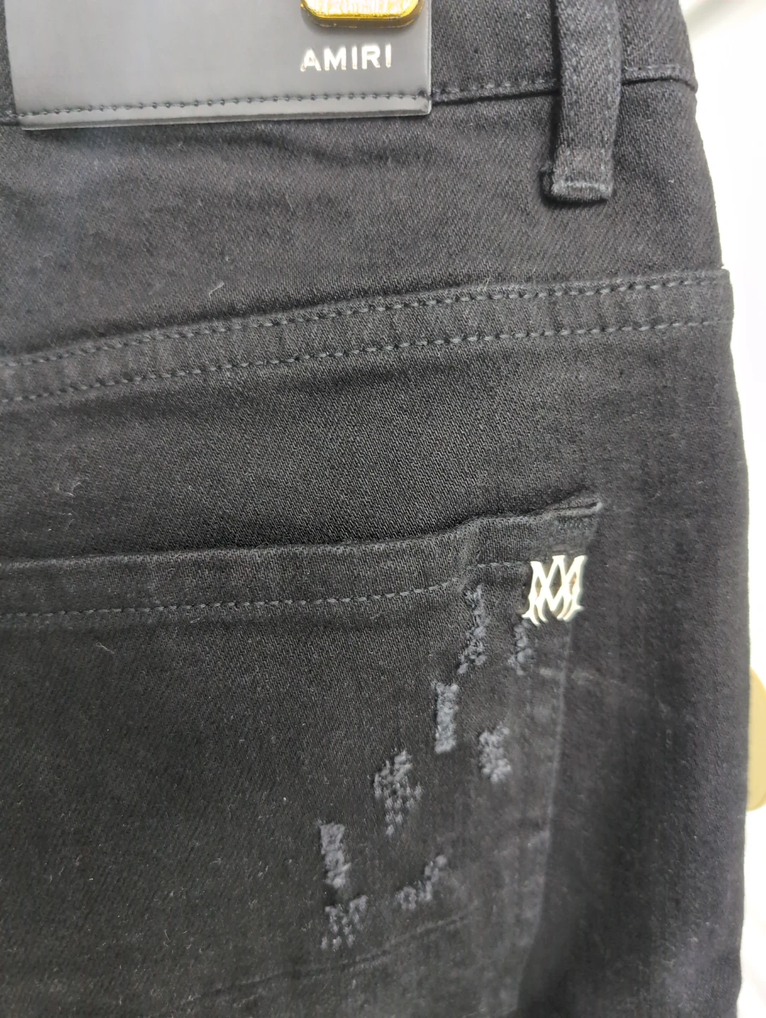 Selling a pair of Amiri jeans in black. These jeans feature a distressed design and the Amiri logo on the back pocket and leg. They are in good condition and ready for a new home!