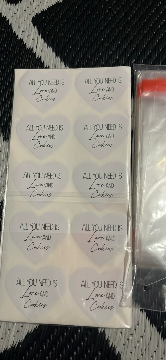 Includes a couple sheet of heart-shaped stickers that say 'ALL YOU NEED IS Love and Cookies'. Also comes with clear treat bags for baking or packaging goodies. Perfect for homemade treats!
