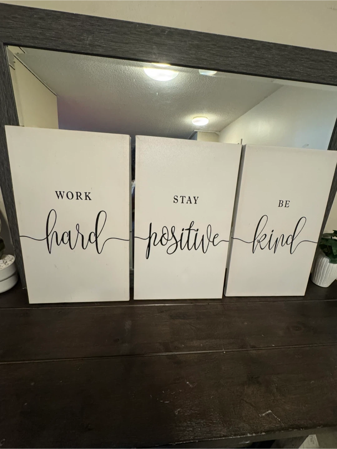 This set includes three canvas prints with motivational phrases. 'Work Hard' is on one, 'Stay Positive' on another, and 'Be Kind' on the third. They're perfect for adding a touch of inspiration to any room.