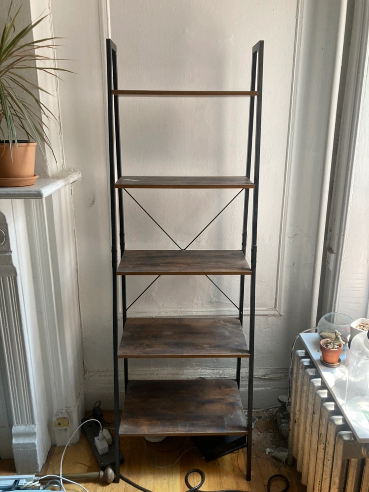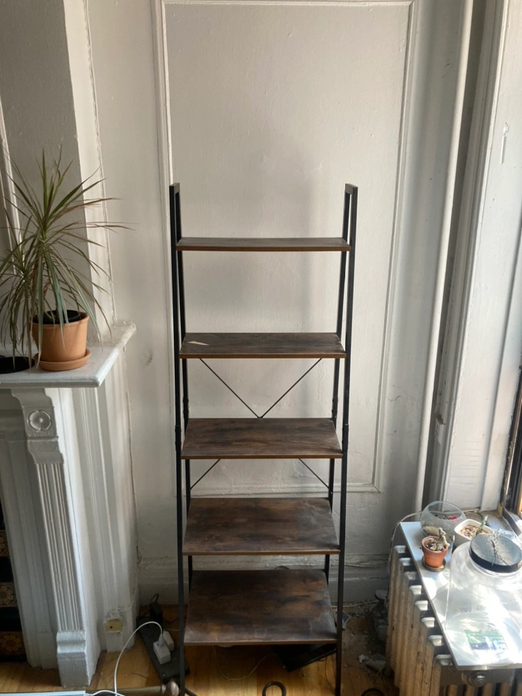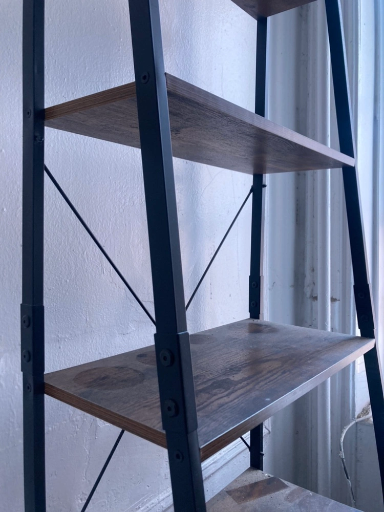 Tall modern wood & metal bookshelf! 67.5in high 22in wide and 15.5in deep at deepest shelf. Good used condition, see photos of general wear & tear.
