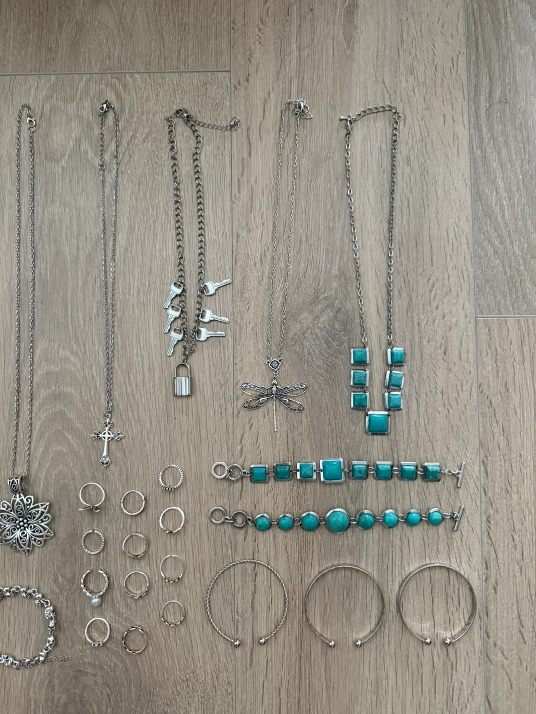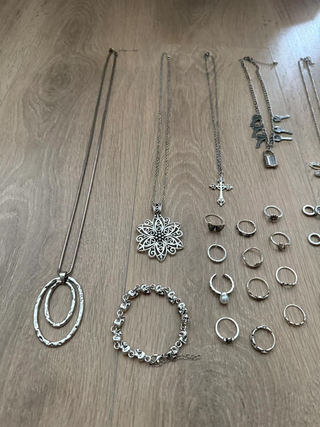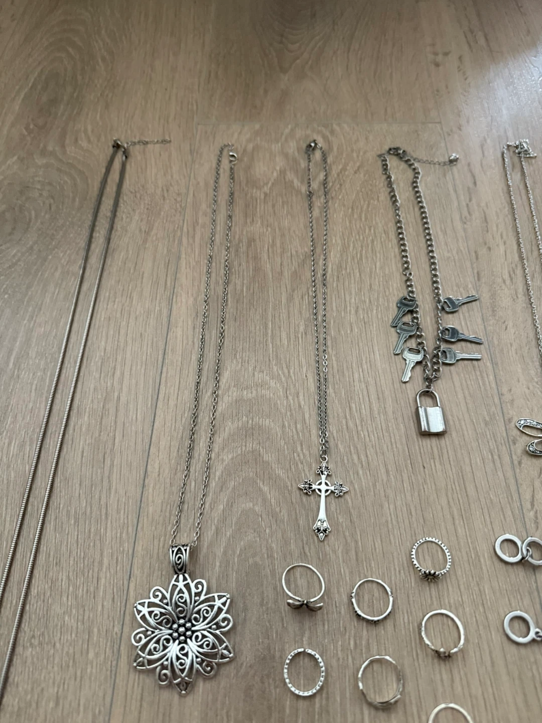 A collection of silver-tone necklaces, bracelets, rings, and charms. Includes pieces with floral, cross, dragonfly, and geometric designs. Great for accessorizing any outfit! Im selling all since Im a student and this is the price for all. Send me messages for individual prices!!
