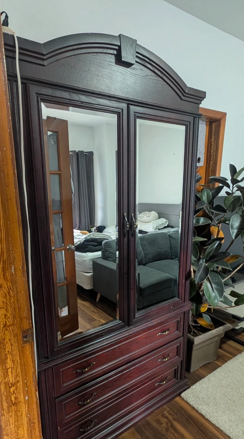 Dark Wood Armoire with Mirror Doors and Drawers