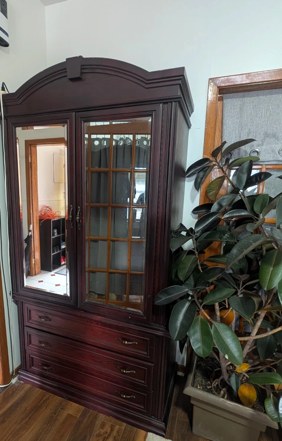 This armoire has mirrored doors and three drawers for storage. It's made of dark wood, giving it a classic look. Offers ample space for hanging clothes or storing folded items.
