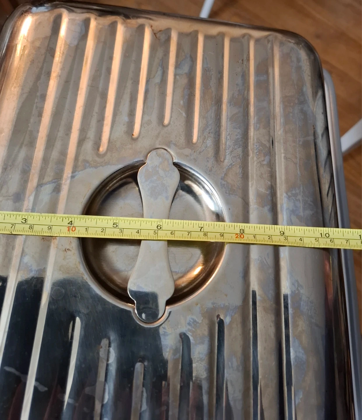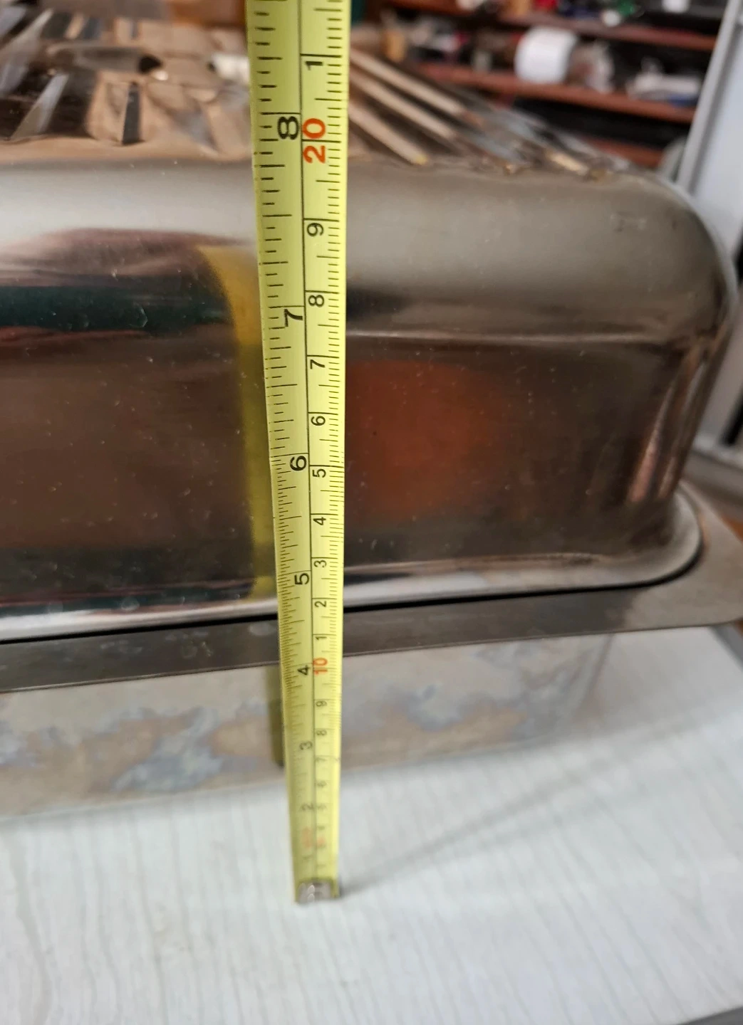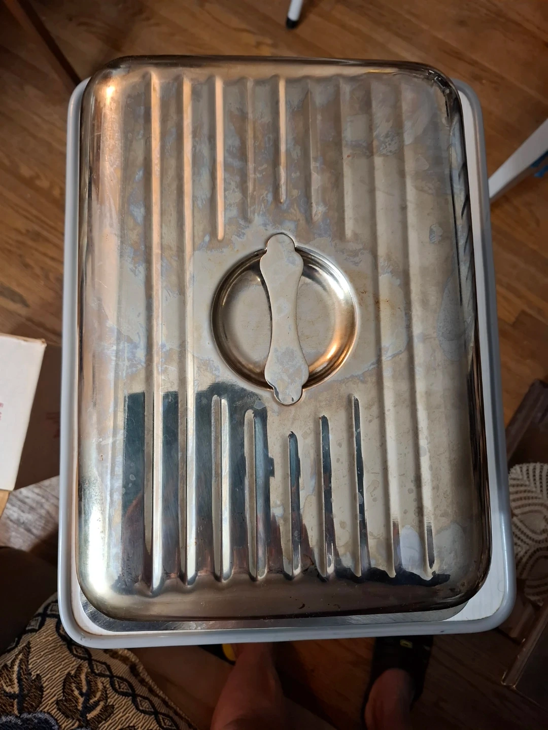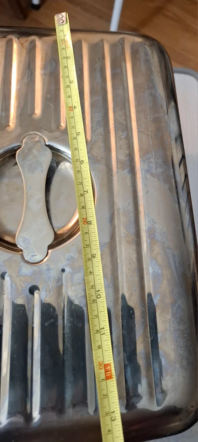 This is a rectangular Stainless steel roasting pan with a lid. It's made of stainless steel and has a ribbed interior. The pan measures approximately 14 inches long by 11 inches wide and 8 inches deep. It's suitable for roasting or serving.