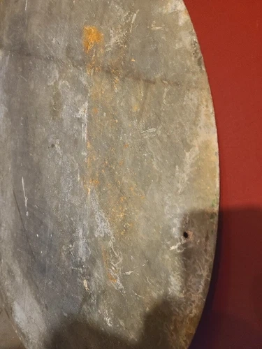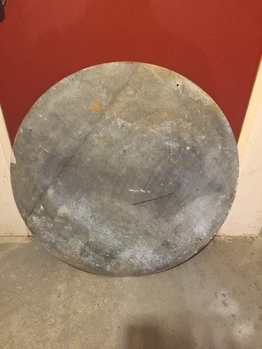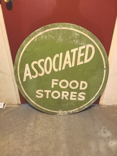 Vintage Associated Food Stores round sign, located in Vancouver BC Canada. Year unknown, but likely early century. Nice patina on front, and a bit of cleanup will make it look nice. Unsure if the front is porcelain or not. Very heavy and appears to be sheet metal or tin. Pretty rigid, likely 1/16-3/8" thick and roughly 3 feet in diameter, but unconfirmed. Feel free to message if you have any questions!