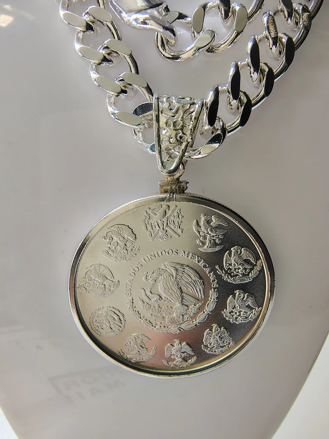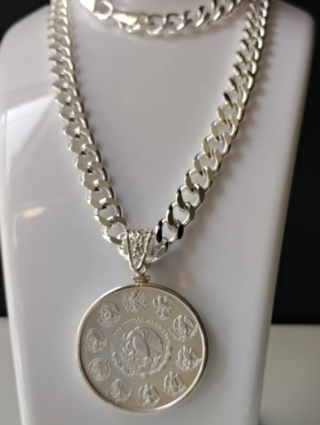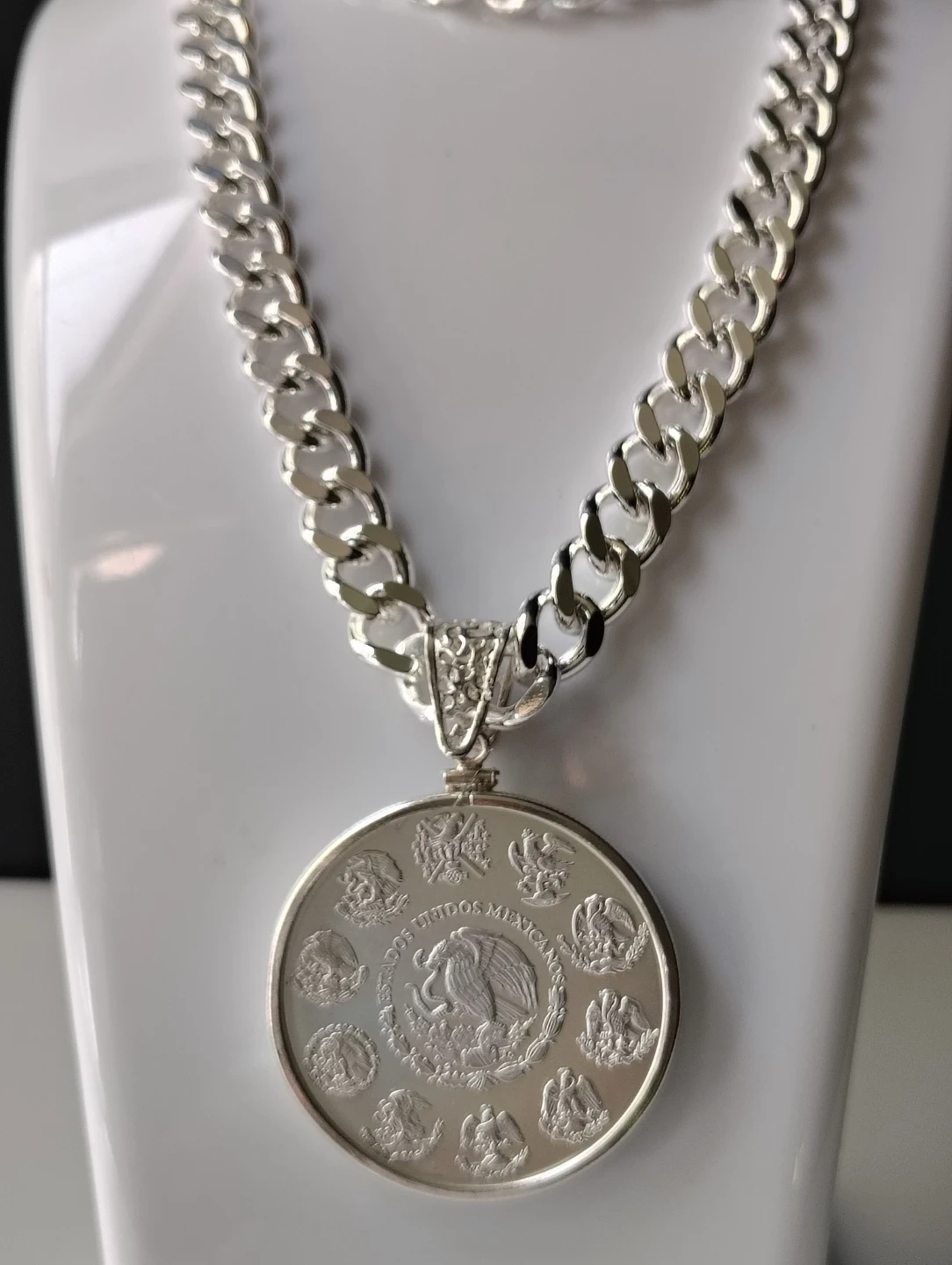 Collar chapado de plata de 24 pulgadas de largo y 10mm. De ancho. Con moneda de plata 2023 Libertad de México 1oz plata fina.999. con el soporte de moneda silver sterling.