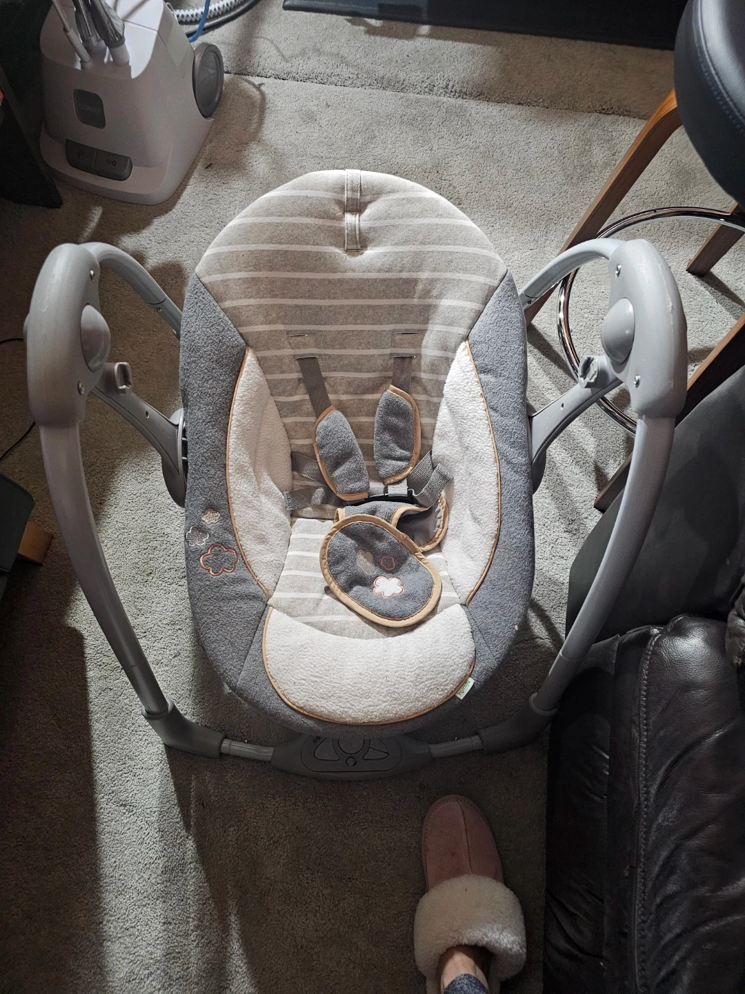 This baby swing is grey with white stripes. It has a soft cushioned seat and a 5-point harness for safety. The frame is sturdy and it's designed for comfort. It would be useful for soothing a fussy baby.